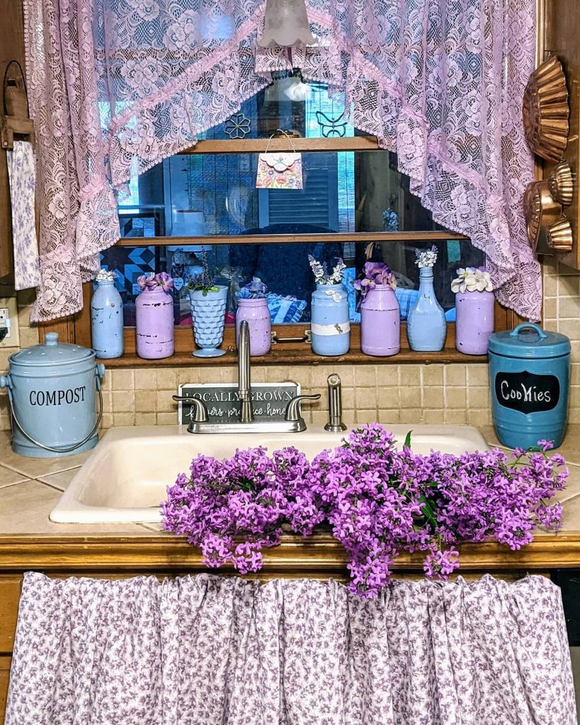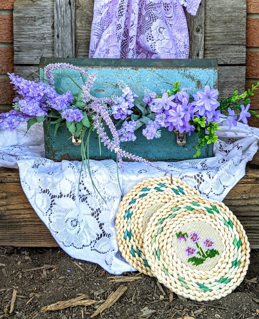 Lace and shades of lavender are lovely in this outdoor vintage vignette. The greenish blue toolbox is one of my favorites for floral displays. It has just the right amount of rust, and the color is divine.