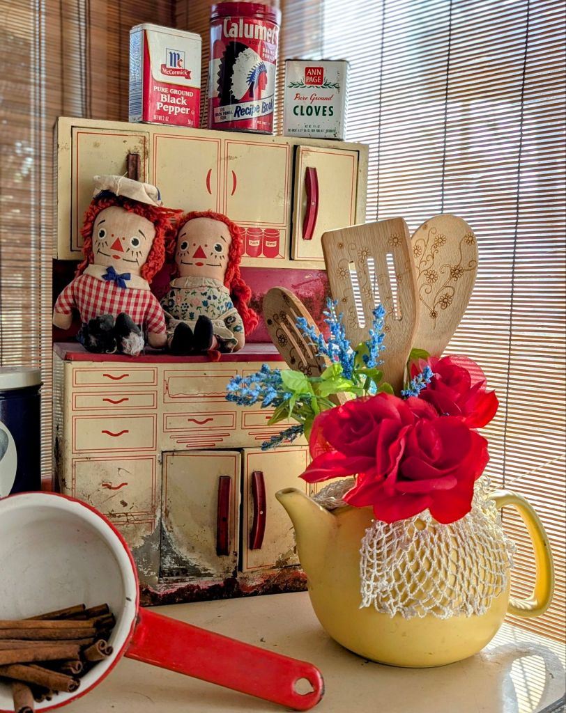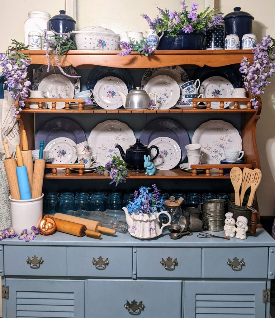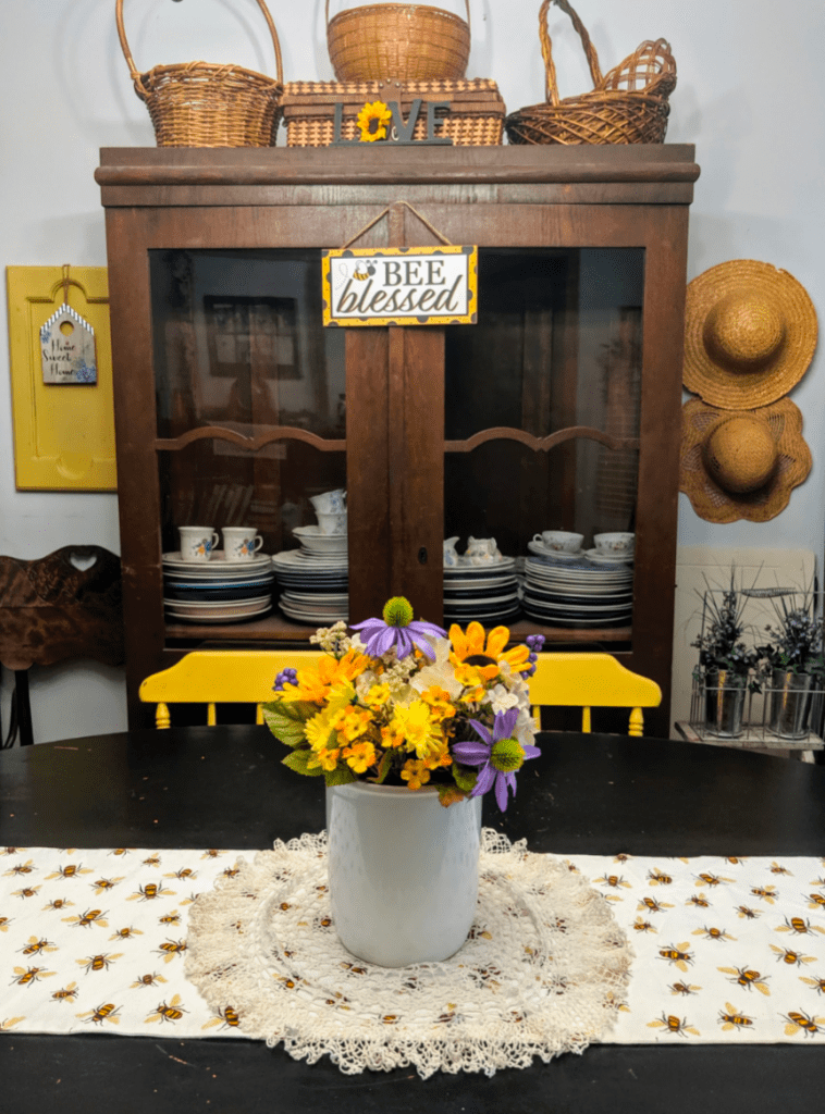 Flowers take this hutch to a whole new level of pretty. Doesn’t the repurposed teapot vase capture your admiring eye?!!!