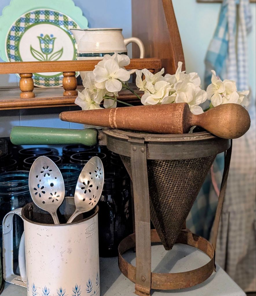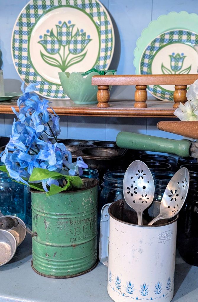 It’s spring in the kitchen, with colors of blue and green in abundance. This precious green sifter fits in well, showing off a bouquet of blue flowers.