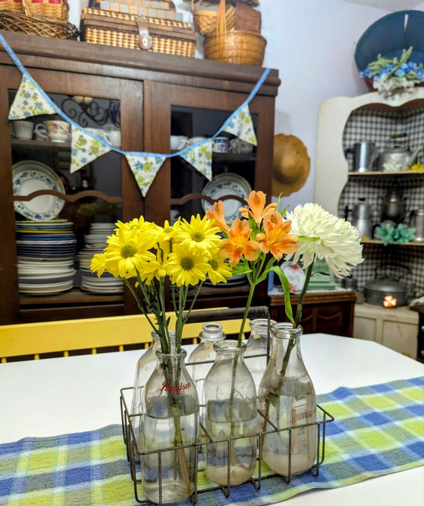My husband likes to buy me fresh flowers from our local grocery store, Hy-Vee. They sell clearance bouquets for $3.99, and I find it a fun floral challenge to keep the blooms from wilting. Repurposing vintage milk bottles as vases is easy peasy; just add water!