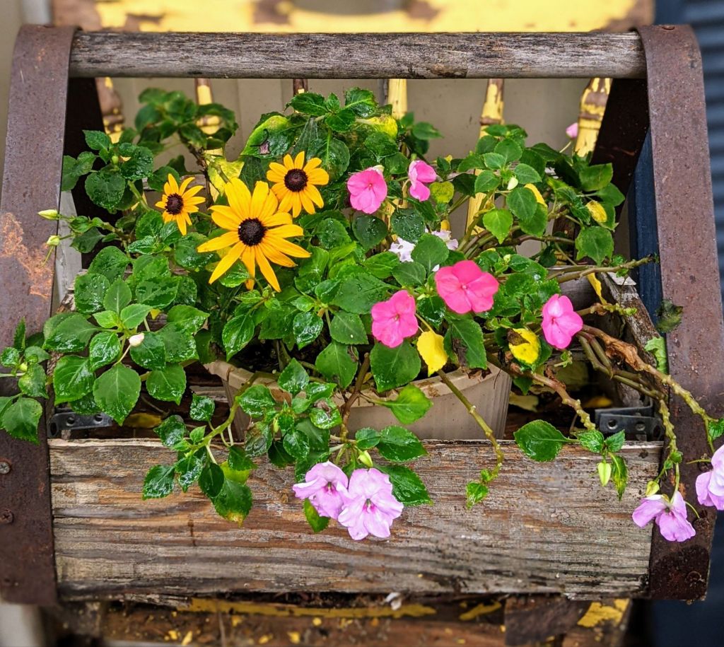 My first husband was a wood worker and collected antique/vintage tools in this old tool caddy. After he passed away, I repurposed his caddy to hold flowers. The bottom of the vintage tool caddy is beginning to decay from years of use, so I now remove the flower pots from the caddy before watering to preserve the bottom wood. Using sentimental pieces like this one gives special meaning to the garden.