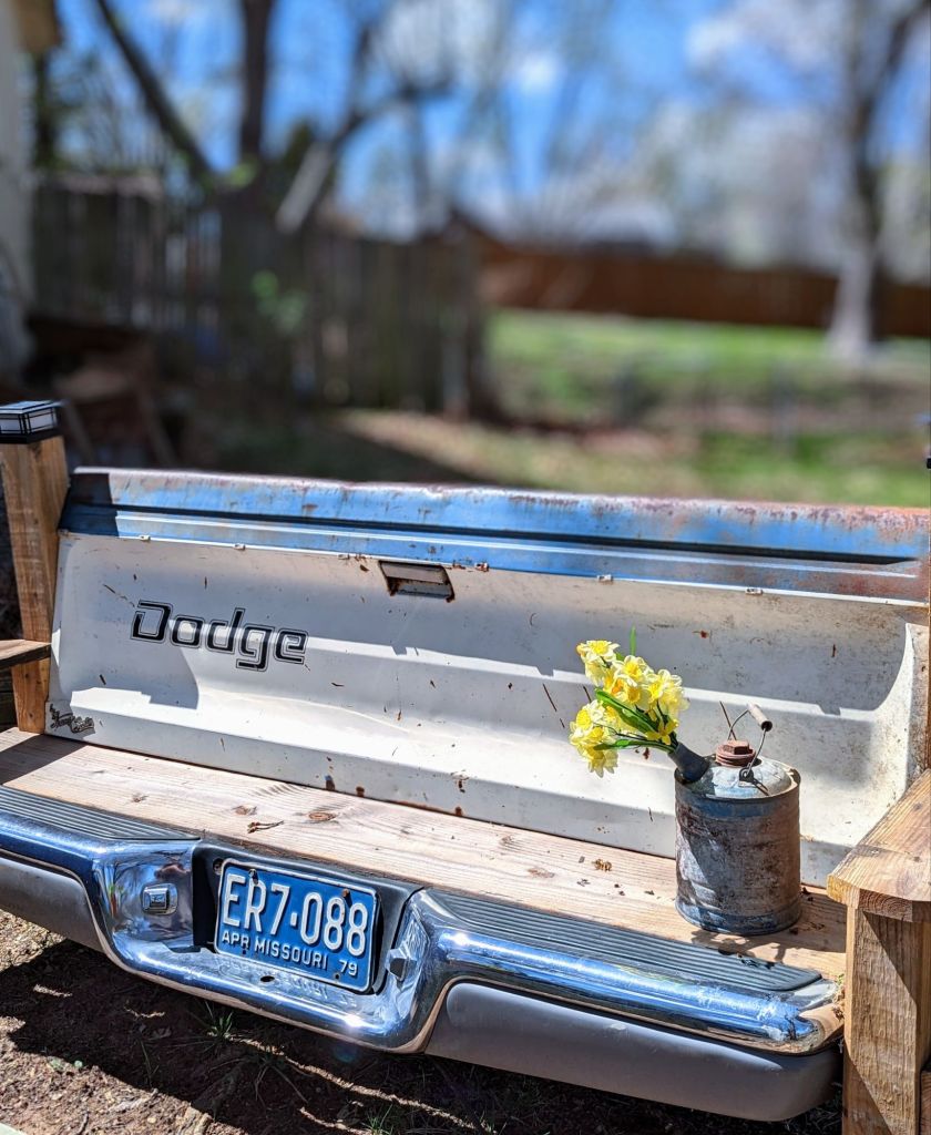 This repurposed tailgate bench is a Christmas gift from me to my husband. The rusty blue oil can pouring out yellow Spring blooms seems fitting. It’s pretty obvious to the neighbors that we like to repurpose old junk into beautiful new creations.