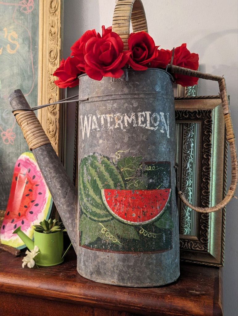 A watermelon themed summer mantel looks yummy with this watering can repurposed as a vase of roses.