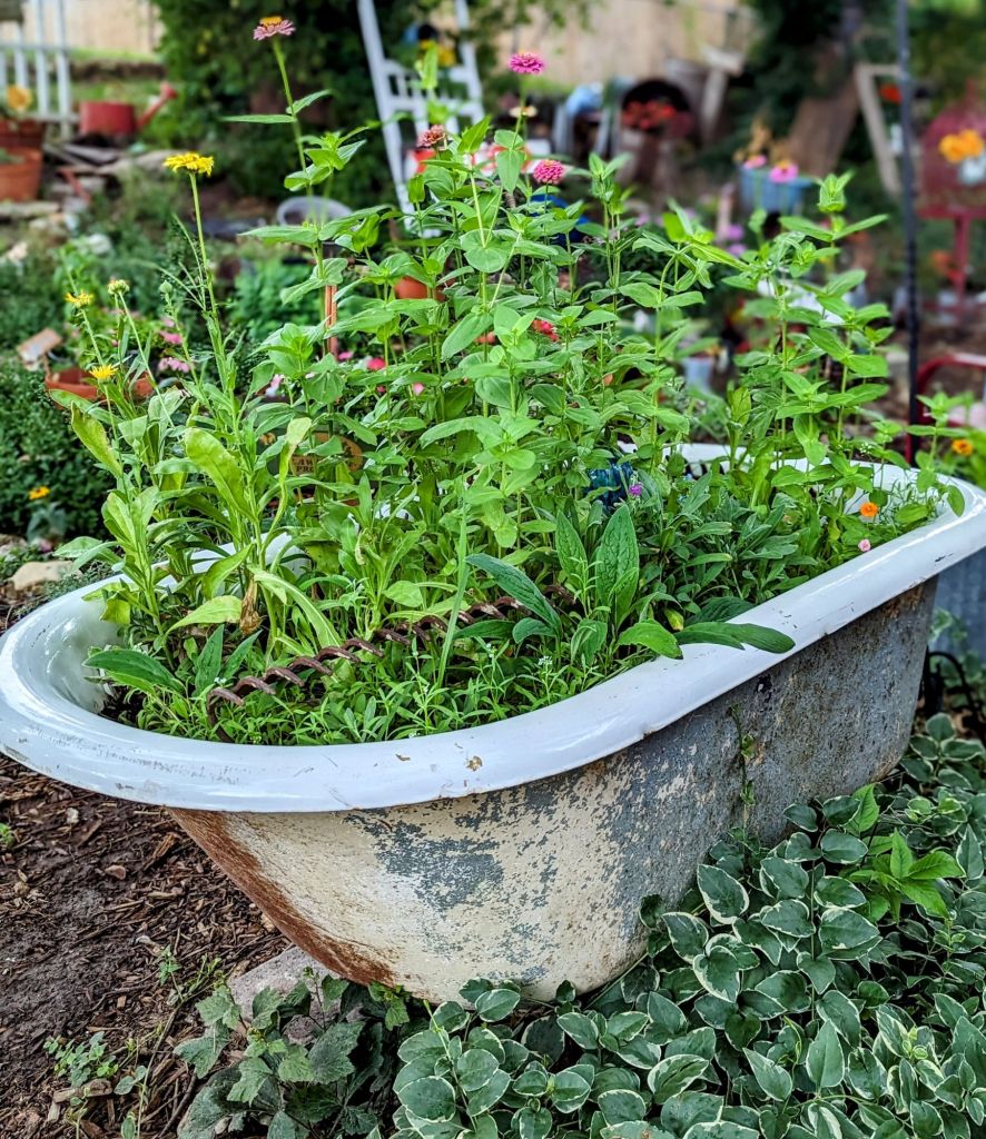 Zinnias planted from seeds are quite the attention getter when they finally bloom. The butterflies and bees really like our repurposed claw foot tub planter.