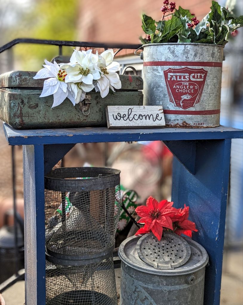 Dollar store poinsettias are a wonderful way to dress up a porch at Christmas time. These are tucked inside repurposed vintage minnow buckets and a rusty ol’ tackle box.