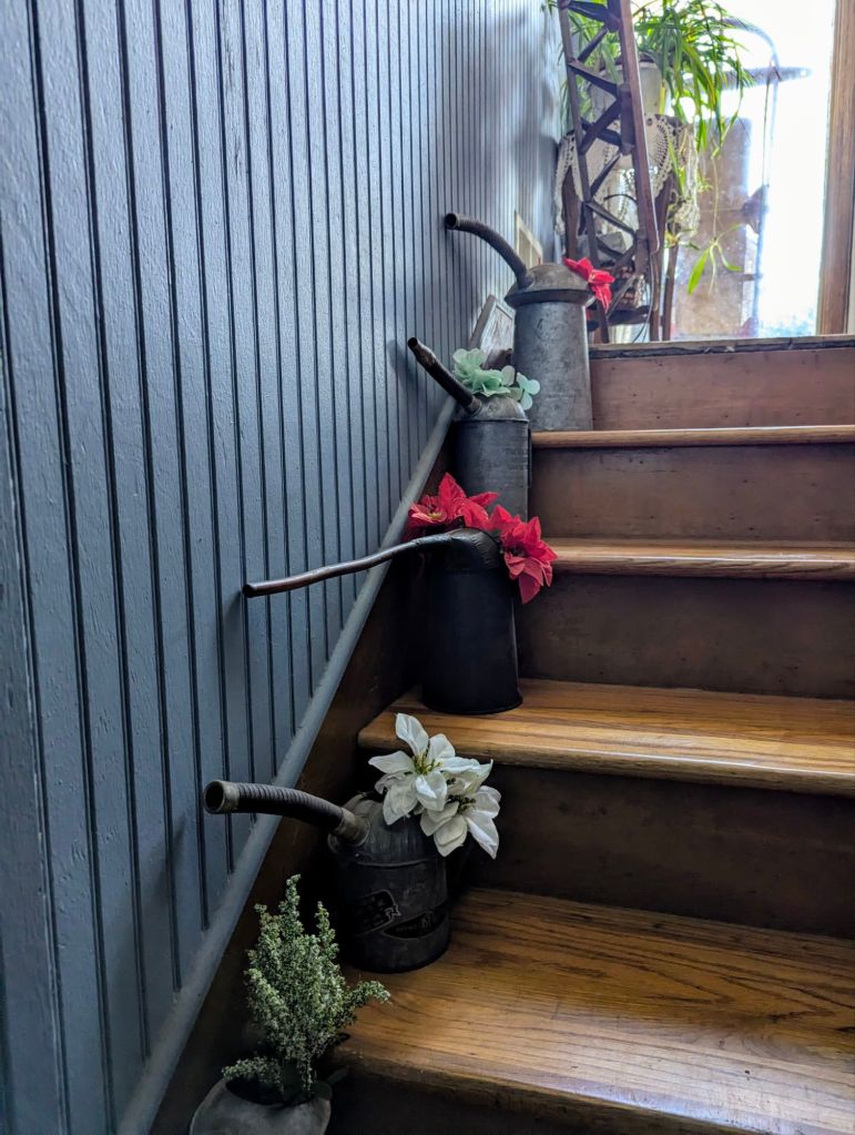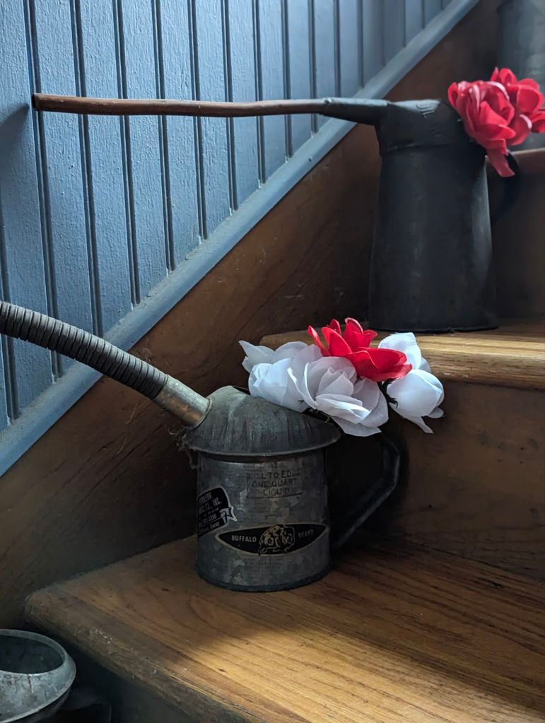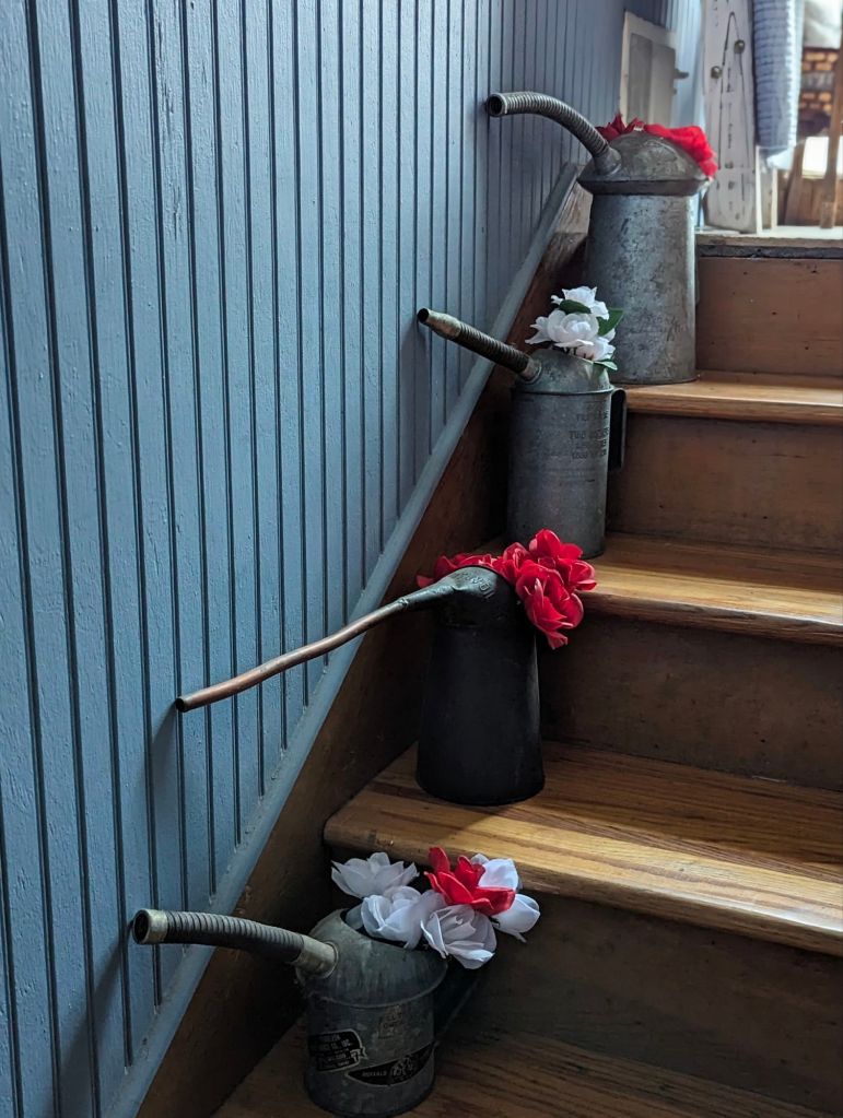 My husband collects oil cans and gas cans. They’re all over the garage with nowhere to show them off. I like to find ways to decorate using his vintage treasures. He’s tickled by my endeavors. One way is to flank the stairs going to our garage with oil cans. I like to gussy them up with flowers, since the stairs are in plain view when first entering our house.