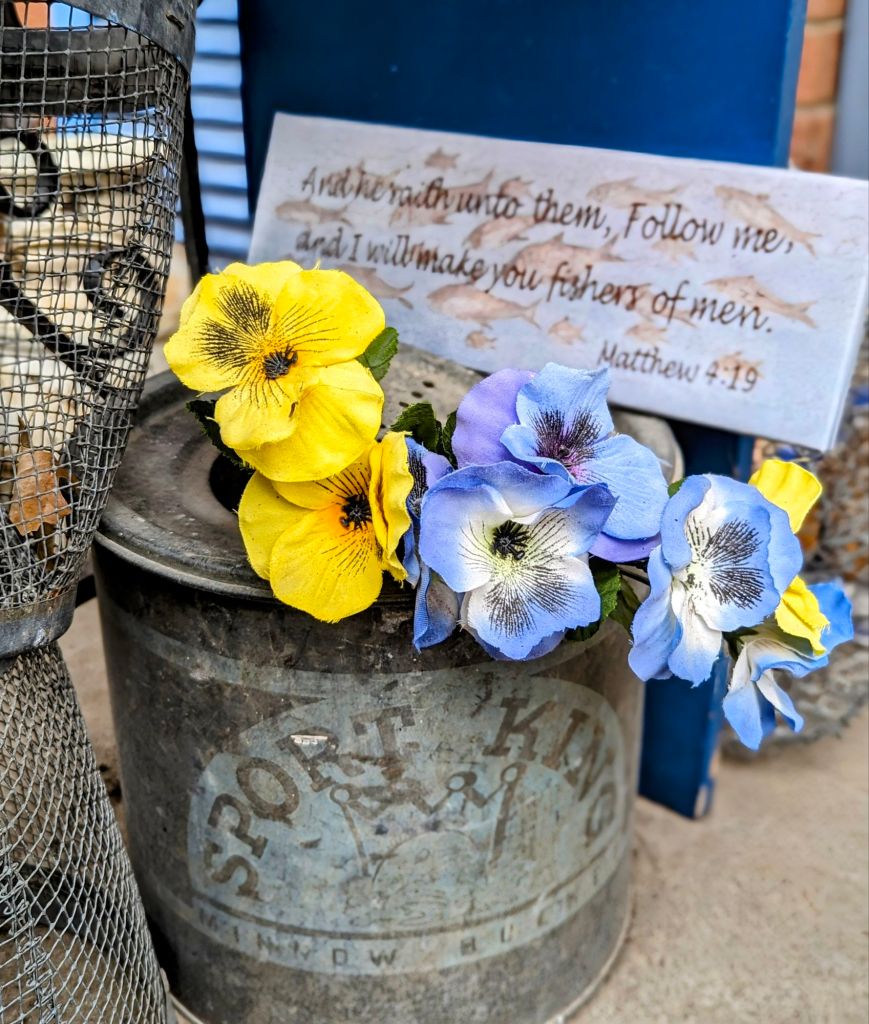 My sweet friend, Lisa, made this fishers of men sign just for me to add to our fishing display. It’s perfect! The minnow bucket, sign and table are all blue-tiful. I tuck the sign under the table to protect it from the weather.
