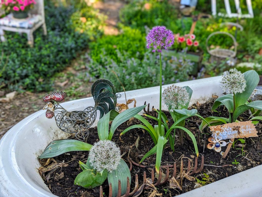 My first year of blooming bulbs in this tub, both tulips and alliums. The broken rake heads help keep the squirrels from digging and destroying hard work and beauty. Old BBQ grills placed on top of the soil from Fall till Spring help with hungry squirrels as well.