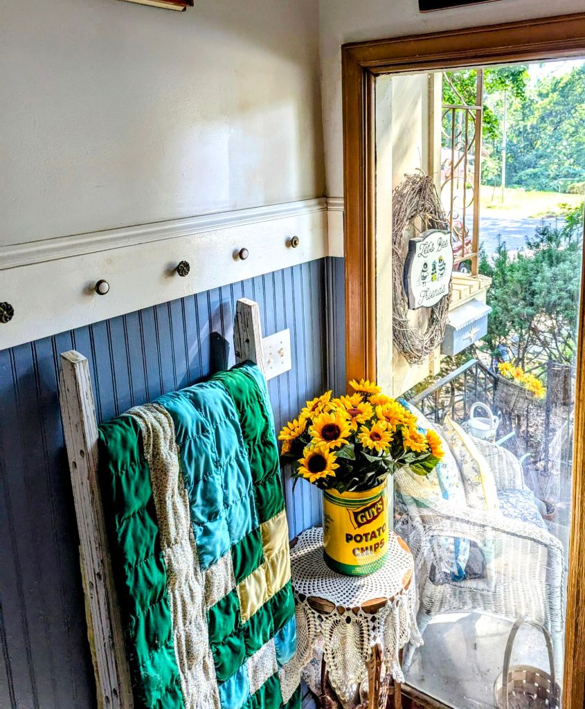 One of my favorite flea market finds is an old mop bucket. It’s perfect for displaying flowers. This is a wonderful example of thinking outside the vase. I get so many compliments on this repurposed mop bucket. People enjoy the contrast of seeing an old junky mop bucket filled with beautiful blooms. I typically fill it with faux flowers that can easily be changed out from season to season.