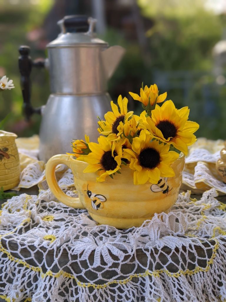 Who needs a large mug filled with a vanilla cinnamon latte when you could have a mug overflowing with a honeybee and sunflower bouquet!