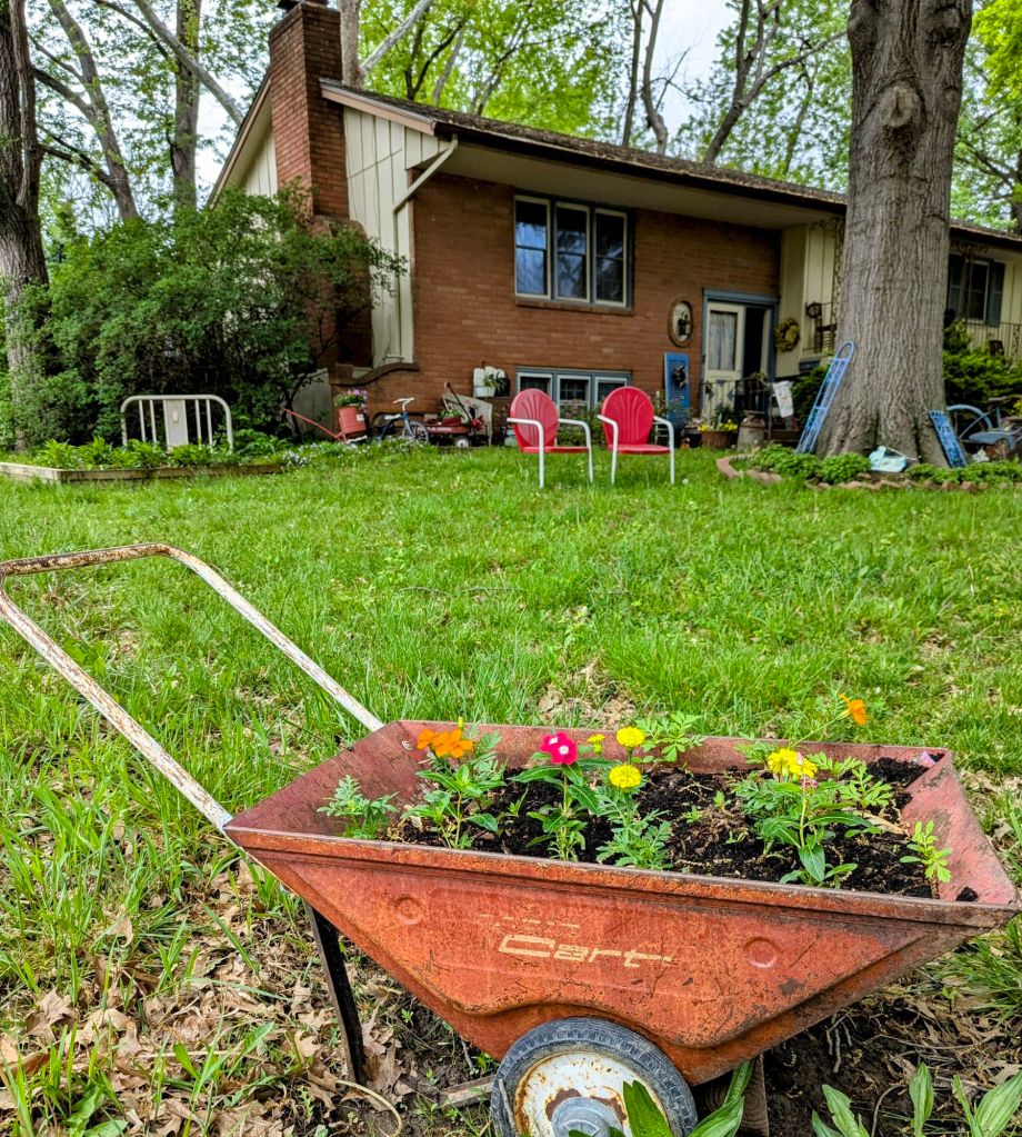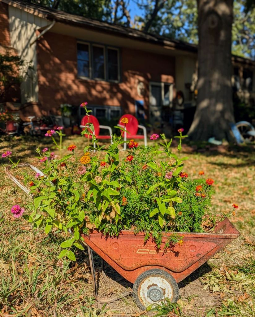 This cute red Cart now resides on the corner of our front yard. It’s the first thing others see as they approach our home. It makes a statement of what’s to come. These flowers are the result of sowing seeds directly into the Cart’s soil. They look happy.