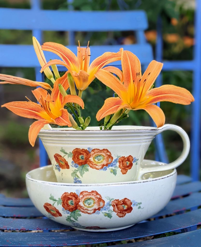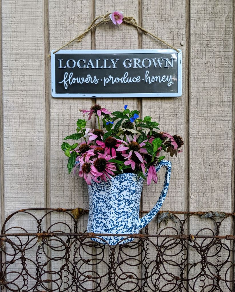 Do you set out fresh flowers in your garden? When the weather is nice, and the gardens are blooming, I like to create backyard bouquets and display them in our outdoor living spaces. One of my repurposed vases of choice for fresh outdoor bouquets is a pitcher and basin. Very delicate! Garden vignettes make me smile!!!
