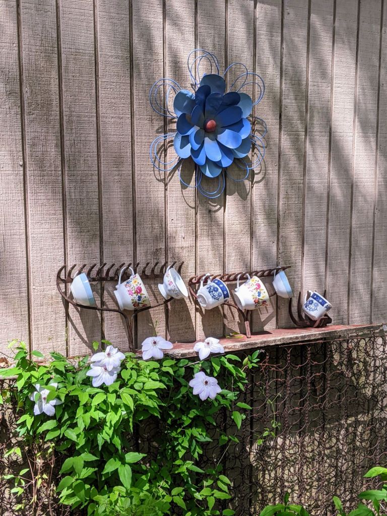 Provincial Bouquets of plates are growing in this shady garden. Collecting these matching plates was an exercise in patience. I planted vintage floral plates, repurposed as both a border and fancy fence, to keep the dogs at bay.