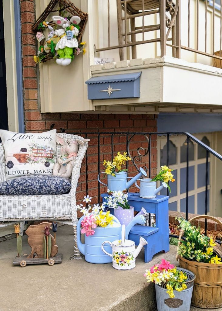 In early spring, I like to decorate my front stoop like a flower market. I use lots of watering cans and faux flowers. It’s still too soon to set out real flowers with freezing night temperatures. This absolutely sets the stage for Spring!