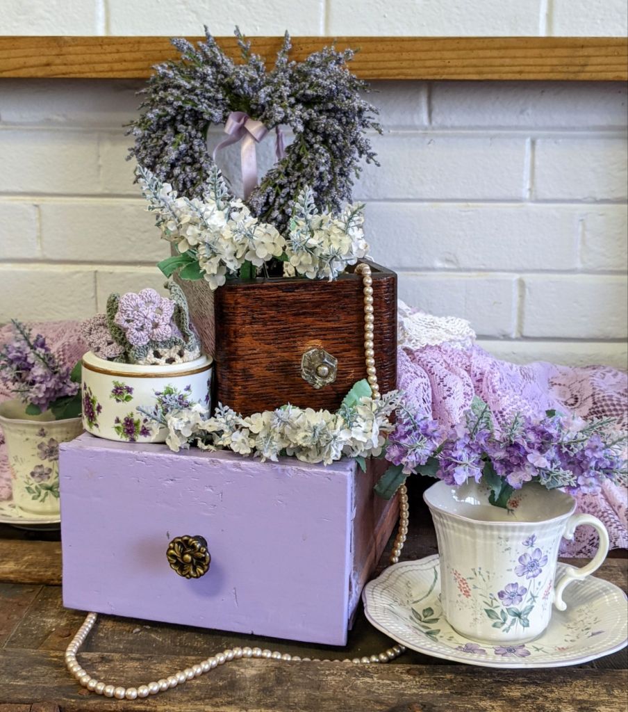 Smaller drawers stacked and styled with flowers create a lovely vignette for the top of a dresser, end table or buffet. Notice the matching flowers on the dishes. The shades of lavender tie it all together.