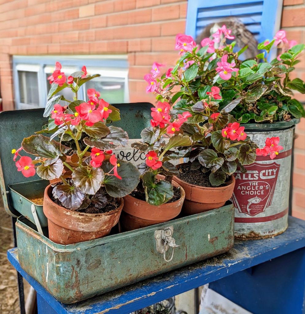These toolboxes add to our backyard’s patriotic charm. Begonias are planted into a rusty toolbox loaded with potting soil. Potted herbs sit inside the red toolbox.