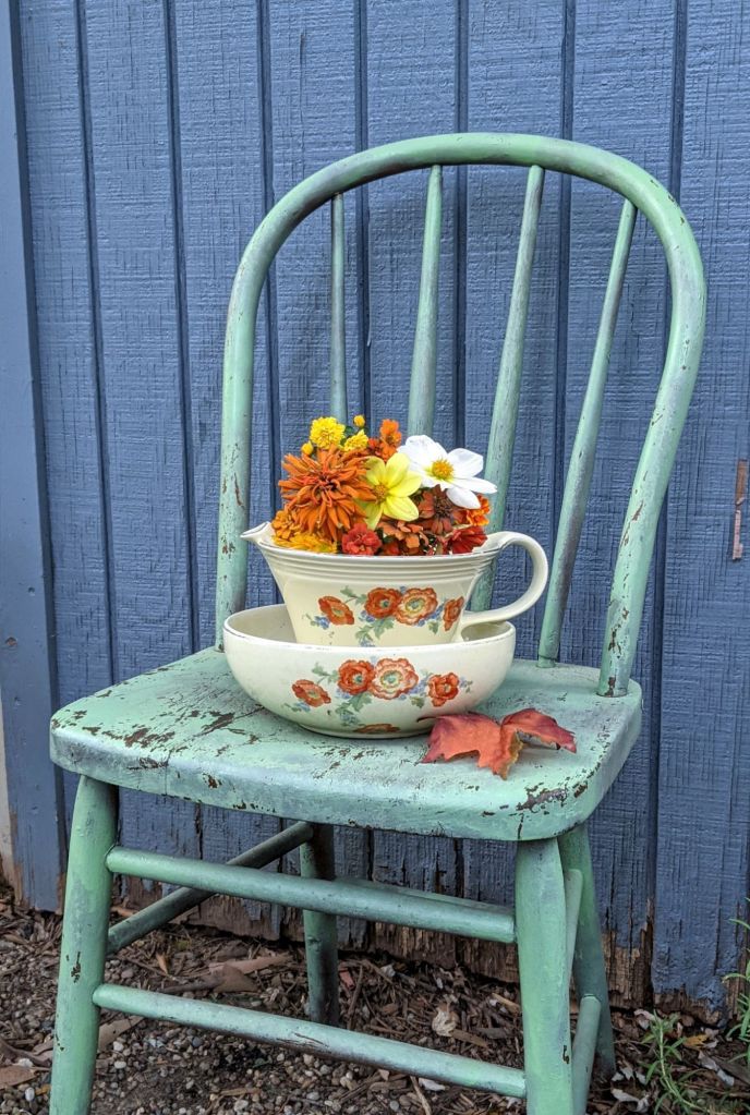 Isn’t this GORGEOUS?!!! The colors are amazing on the pitcher and basin, all the more reason to repurpose this as a vase. It’s fun picking backyard bouquets and stationing them in secret spots along the garden paths.