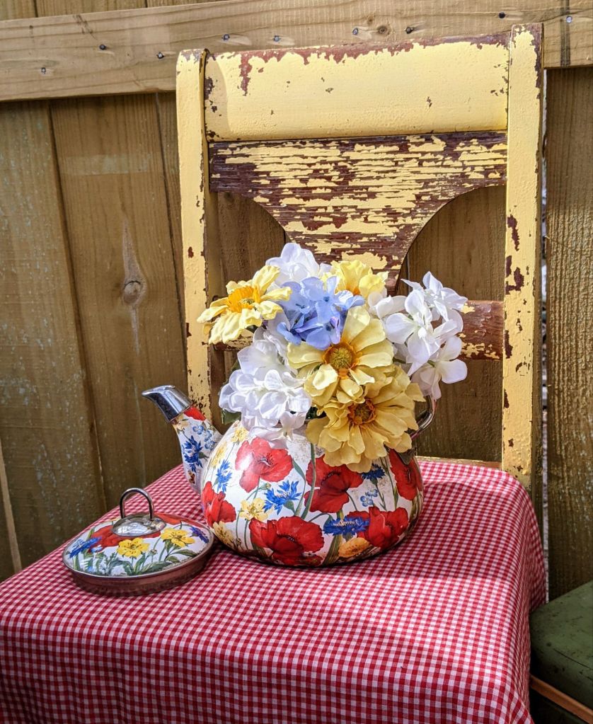 A once favorite tea kettle, left on the burner for way too long and ruined on the bottom…. She looks adorable in the backyard all decked out with flowers.