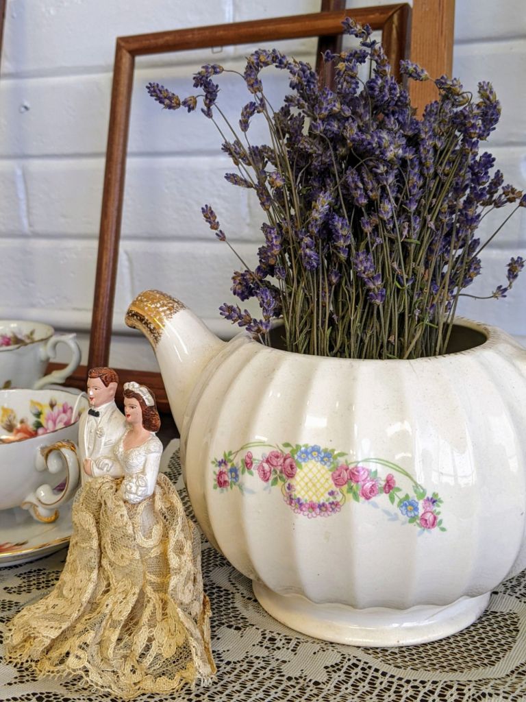 Dried lavender looks lovely in a free curbside find, set beside my parents’ wedding topper. This is an example of a teapot, tossed aside because it has no lid, and given new life, repurposed into something treasured.