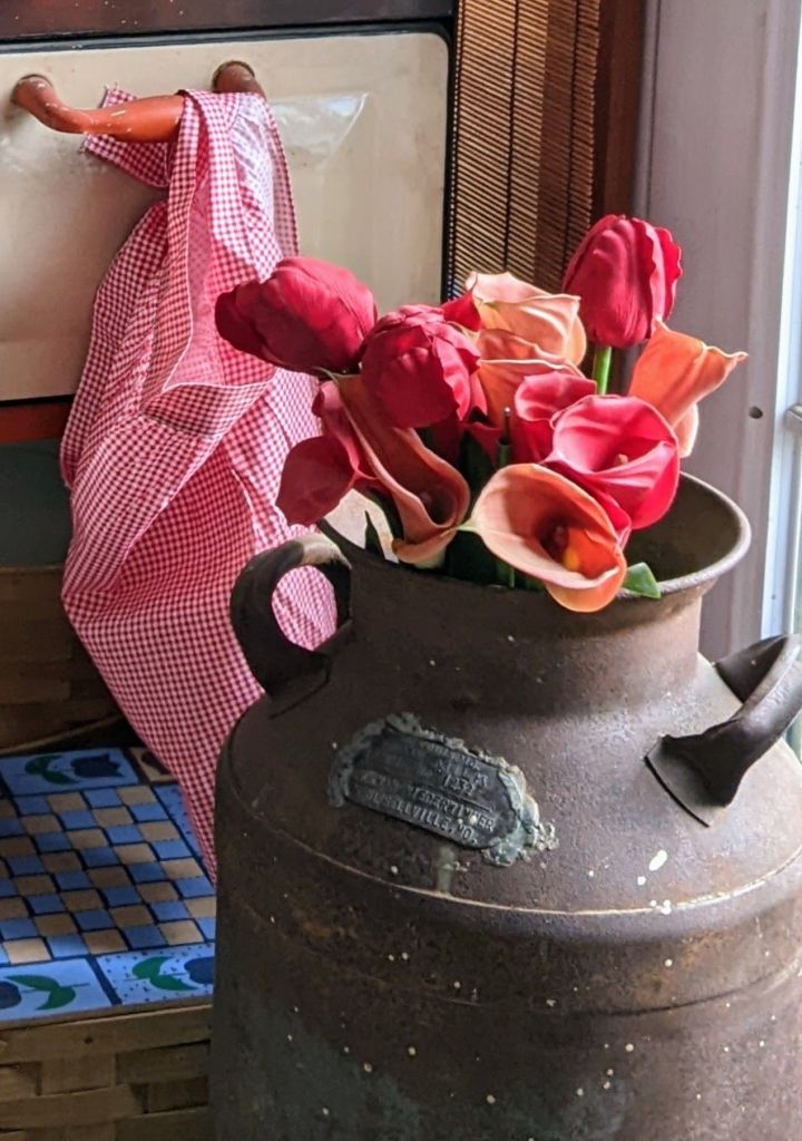 These faux flowers are a gift from Aunt Martha, who rescued them from the trash just for me. Their long stems are the perfect length for an old dairy farm milk can.
