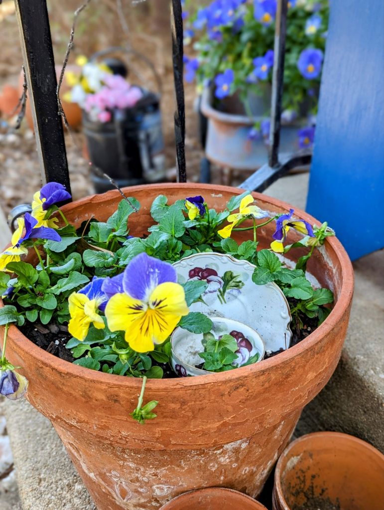 Broken tea cups and saucers are so lovely when planted in the soil of a clay pot, right beside the flowers.