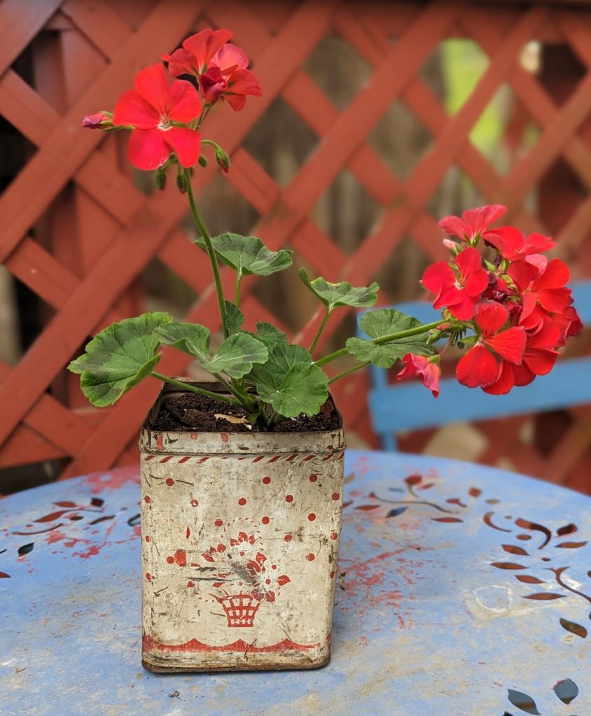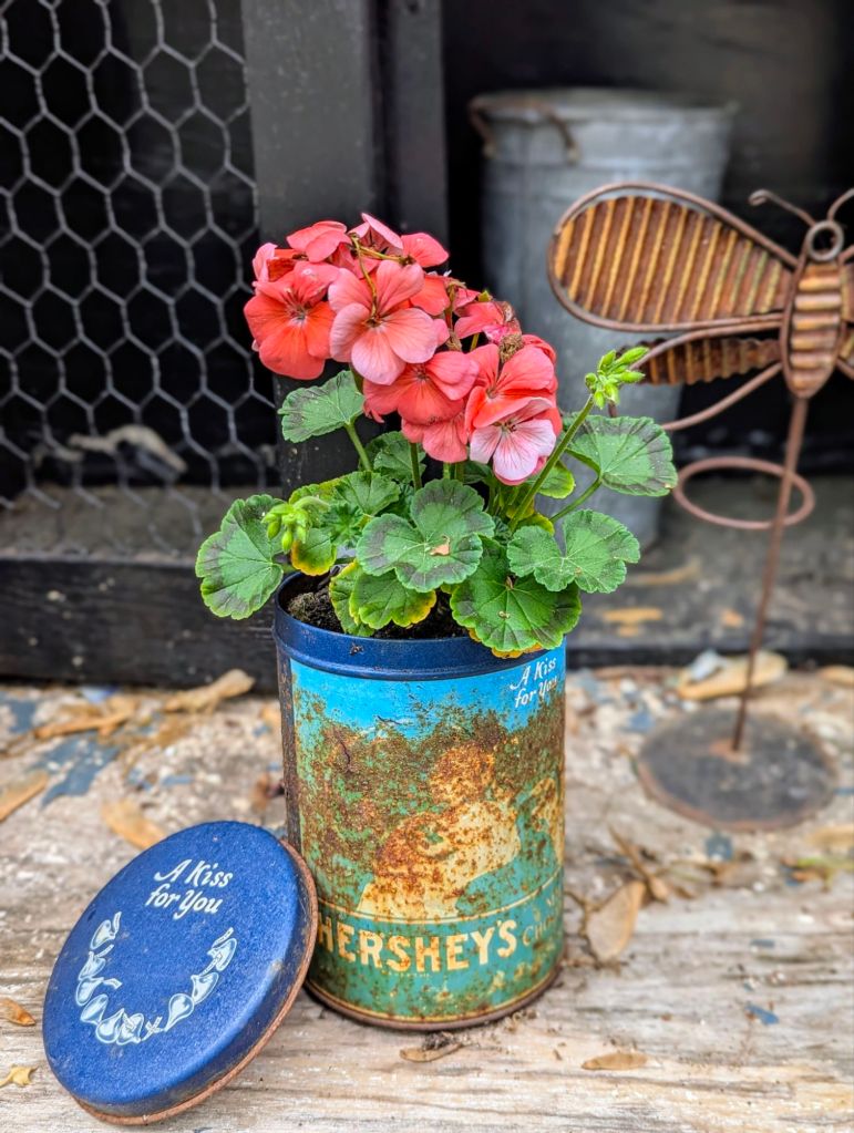 I call this our anniversary tin. The graphics are getting rusted over, but A Kiss for You is still in view. I plant a geranium in this tin every year for our anniversary.