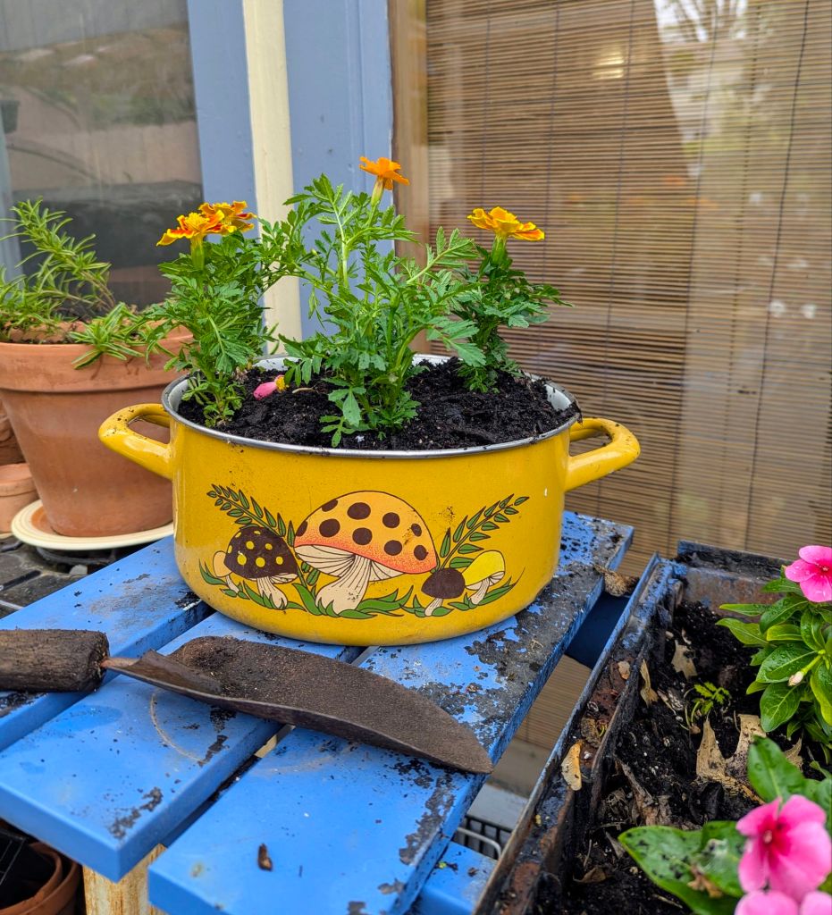 This darling mushroom pot is a trash pickin’ rescue find. It has drainage holes in the bottom, drilled by the previous owner. Cheerful marigolds in colors matching the pot are sooo cute. In a couple months, this will be overflowing with blooms.