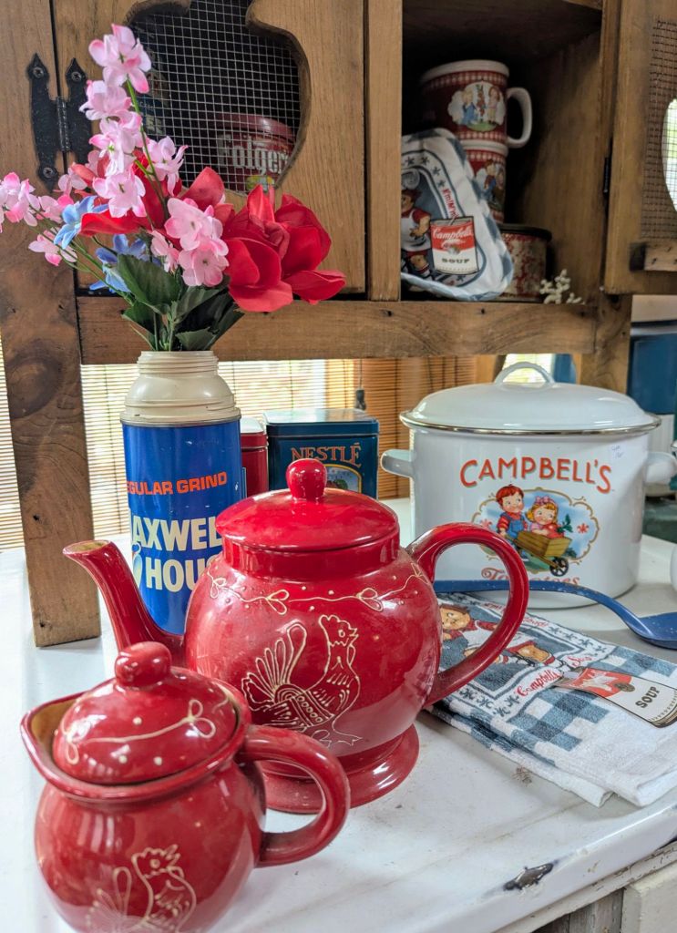 Coffee cups, percolators, teapots and more, they’re all my cup of tea… for flowers! They have an opening, perfect for holding blooms. What more can a gal ask for?!!! From time to time while thrifting, I will find a teapot missing its lid. Not a problem! A lid just gets in the way of a floral display. What others deem as broken, I view as a treasure. Also, don’t be afraid to use faux and dried flowers when designing a seasonal vignette with a kettle, teapot or cup. The end result can be a beautifully creative work of heart.
