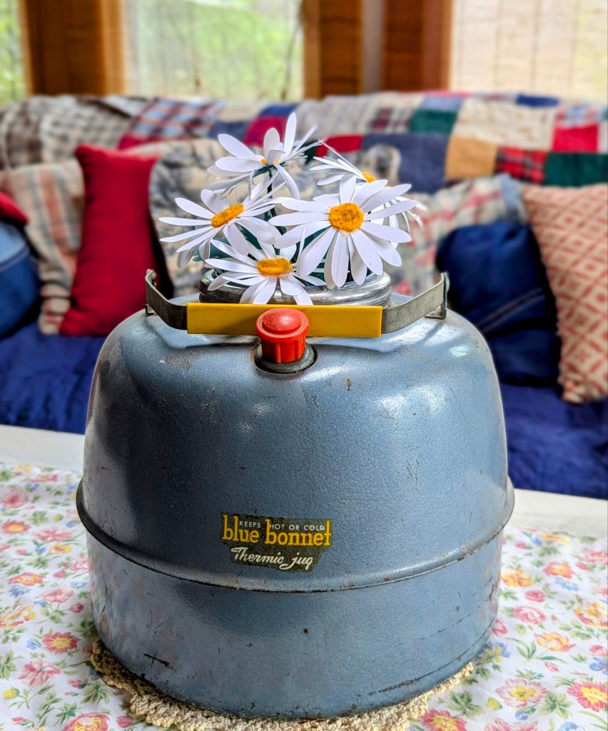 A Blue Bonnet thermos jug and diy daisies are sooo cute as a centerpiece!