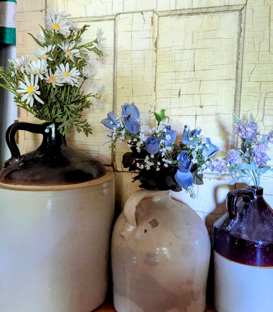 My first crock, from my mom’s kitchen, isn’t our oldest crock, but definitely sentimental. It’s fun finding a crock at a really low price, usually from a small family run estate sale or yard sale. Little by little the collection grows. When decorating for seasons and holidays, crocks can be accented with flowers. It’s all the little touches, like flowers, that make a house a comfy cozy home. Grouping crocks together creates a pretty and impactful display.