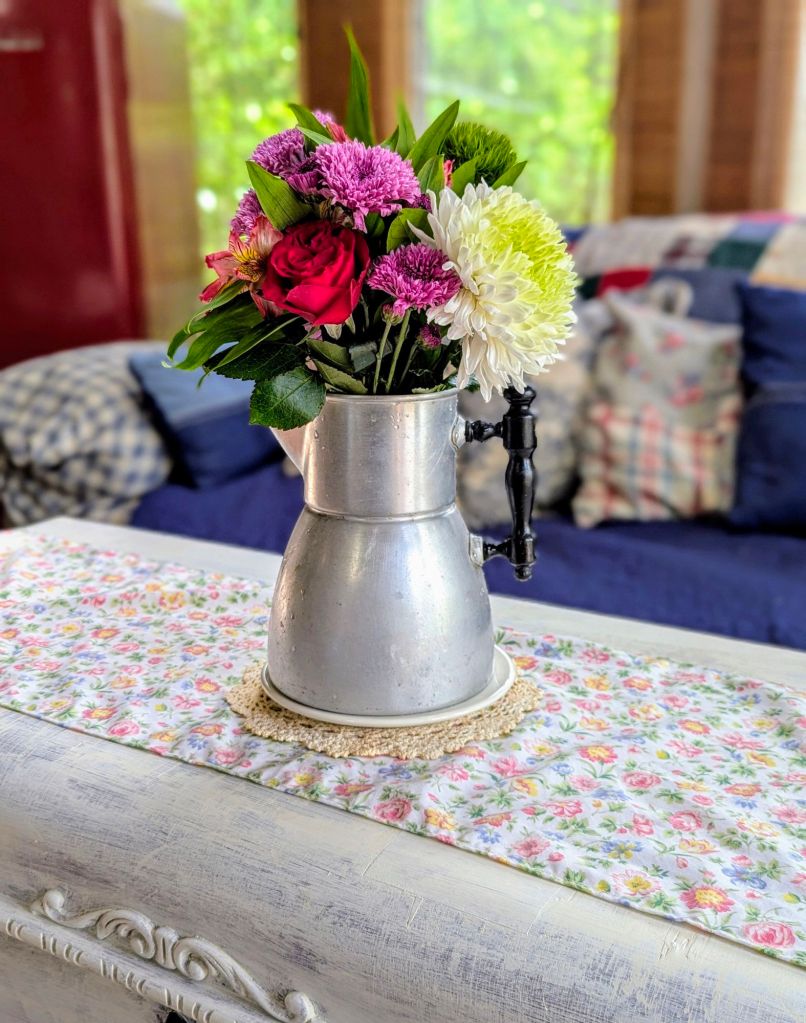 An I Love You bouquet gets center stage attention in a vintage coffee percolator. It fits our style. This example of using fresh flowers in a repurposed percolator vase just brews with blooms.