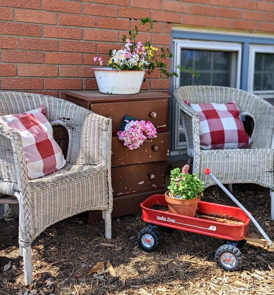 For this charming covered garden area, faux flowers peeking out from a drawer add some needed Spring color to a $4 chest found at an estate sale.