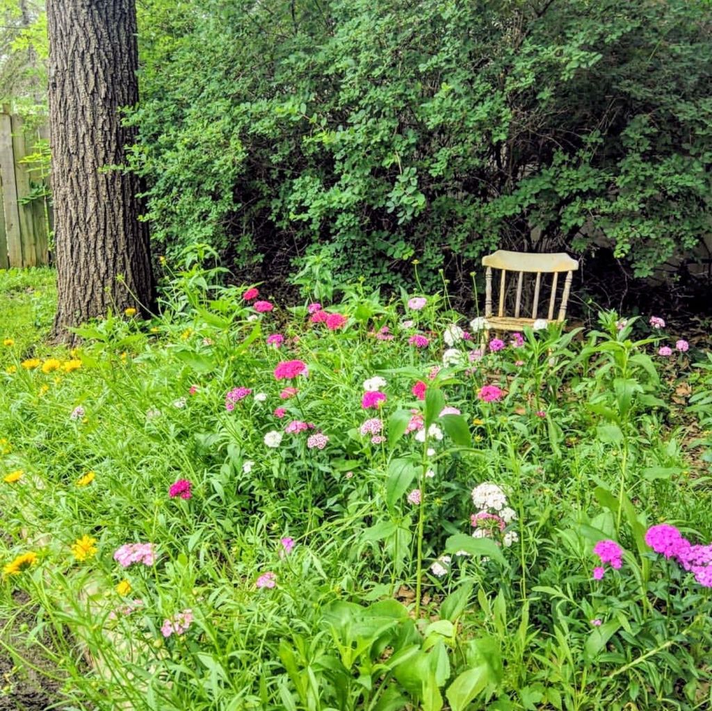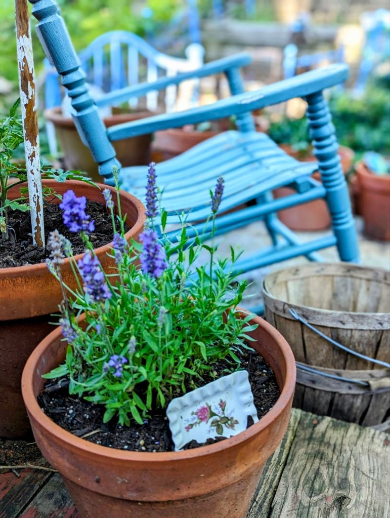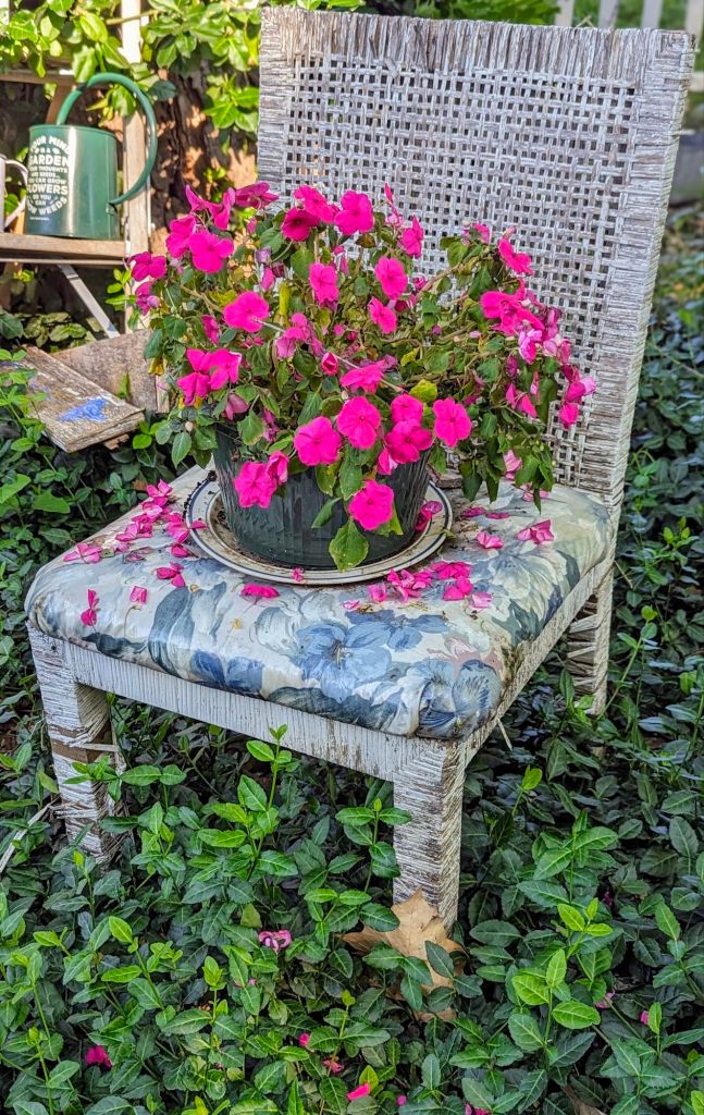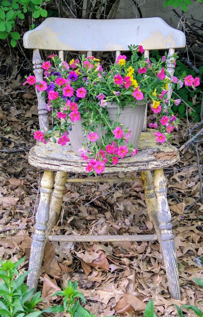 My husband drug this old chair from the basement to the trash. I saw it sitting at the curb… love at first sight. I drug her out to the backyard garden titled Lover’s Lane! There she sits, year after year, always with a pretty potted plant.
