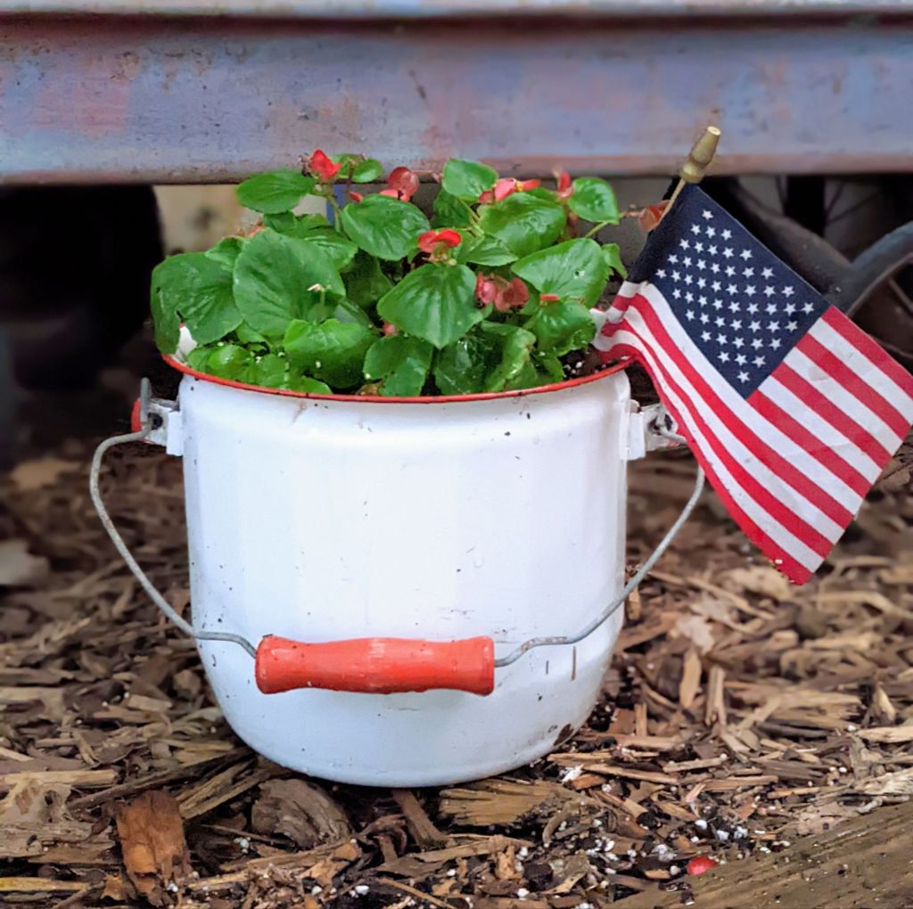 Enamelware trimmed in red is my favorite, not for cooking… but for flowers! A simple summer patriotic display can be created using an enamel pot, red begonias and a stick flag. This pot has rocks in the bottom for drainage.