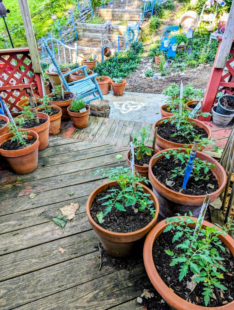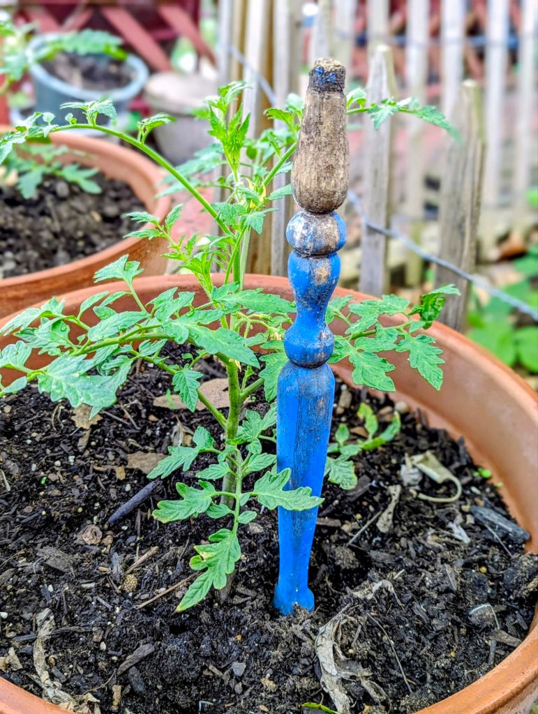 Because I enjoy wooden garden chairs, I have an abundance of spindles. If a chair falls to pieces, I save the parts and repurpose them. These spindles are tomato stakes.
