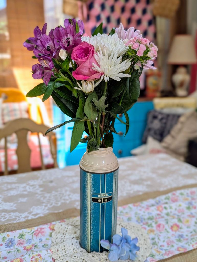 Chilly days call for hot coffee, soup, and a thermos full of flowers. This thermos was a bargain $1 find because it’s missing the lid. Who needs a lid anyways when there are flowers!