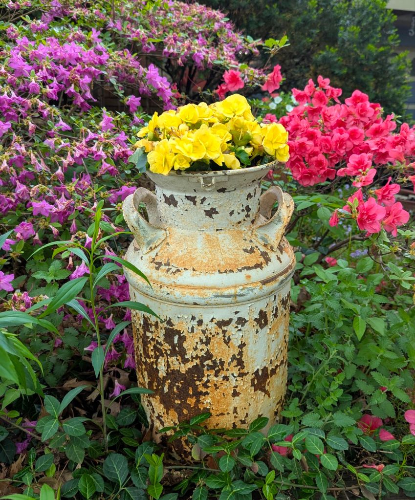 Got milk? Yes we do! Vintage milk cans look extra special when filled with flowers, both faux and real. Just slip a potted plant into the can opening for instant magnificence. If the plant is too small and falls into the milk can, prop it up with a plastic milk jug, brick, or whatever is handy. It’s Spring at Comfy Lane Cottage!