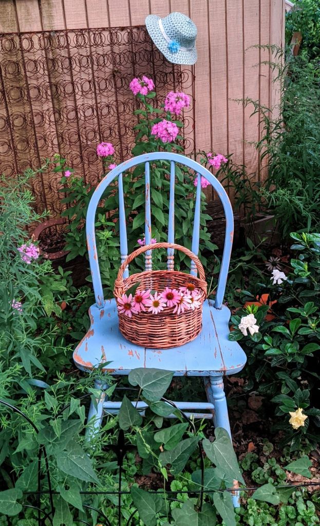 How about this blue cutie! It’s her first summer in the garden. She’s beginning to show her age. A basket of backyard wildflowers is delightful to the eyes.