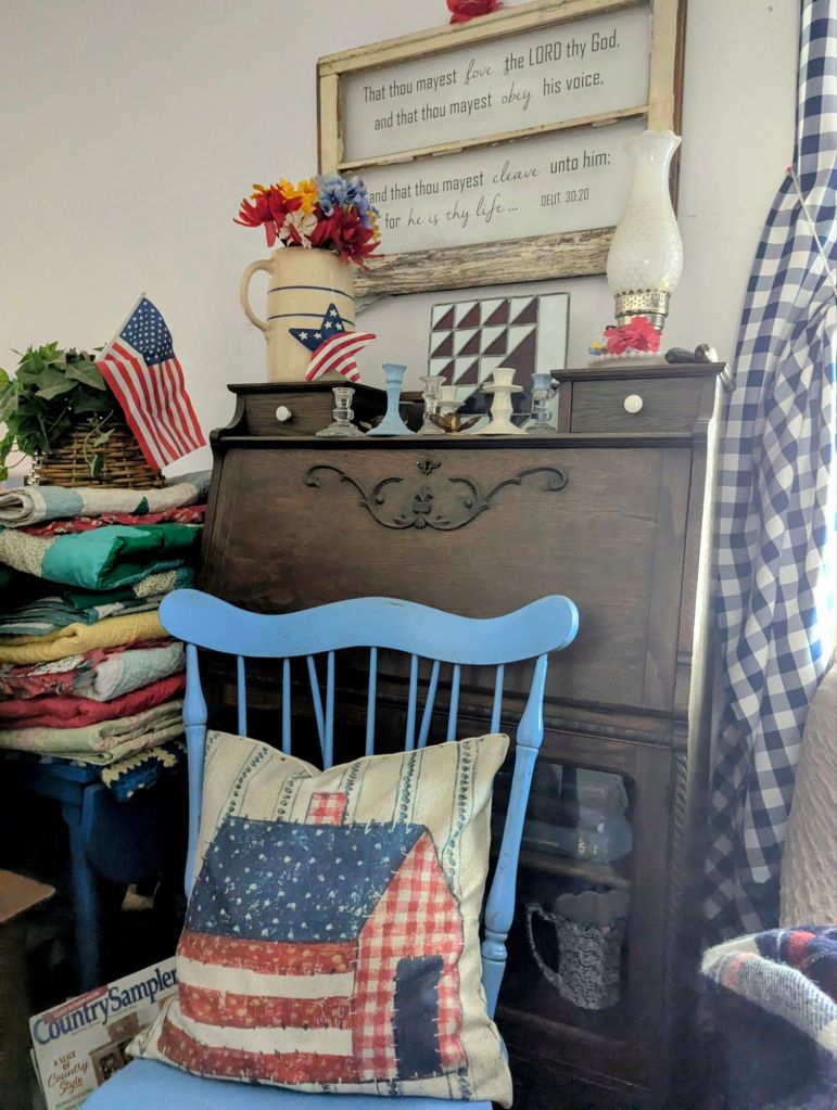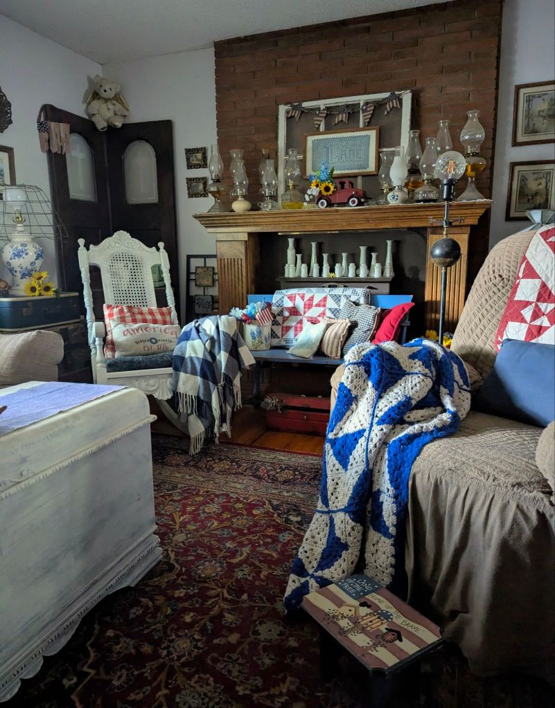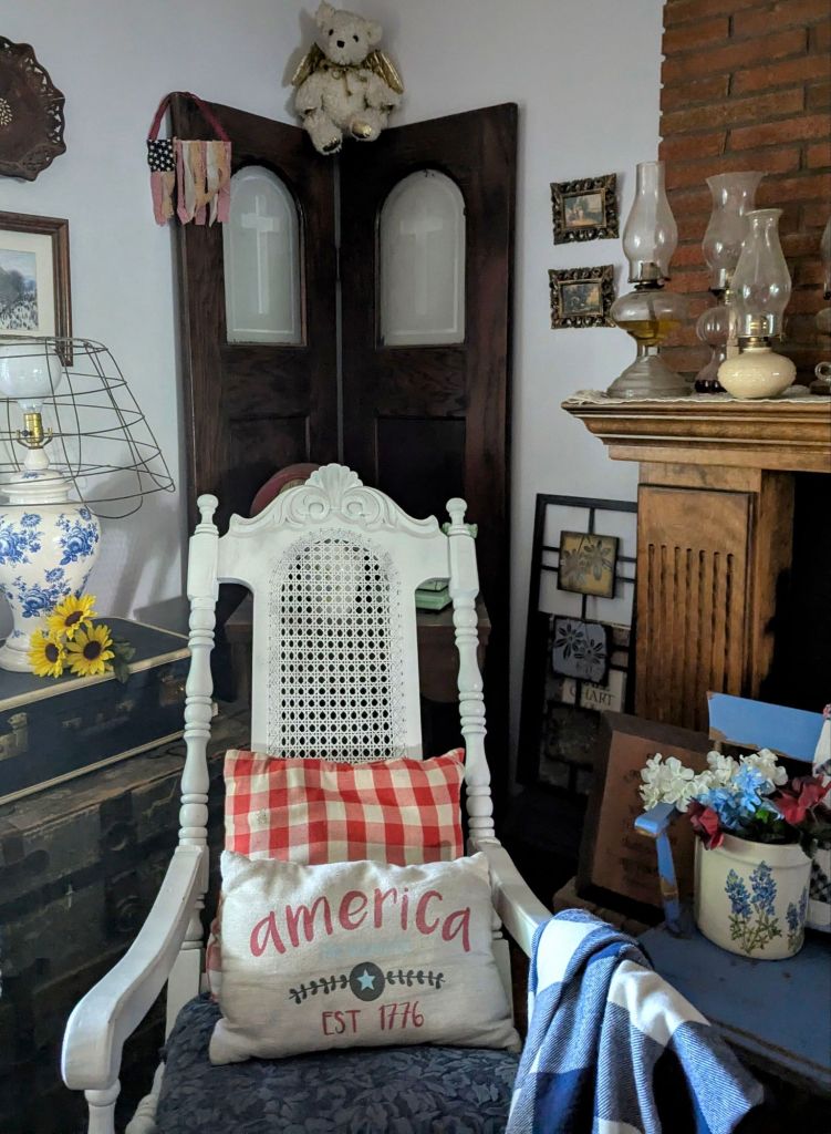 Look at the hand carved details on the rocker! Both the bench and mantel were scored on Friday ReStore dates. The mantel was a perfect fit and completely transformed our fireplace. Lots of pillows, quilts, throws and flowers, all in red, white and blue adding to the Americana look.