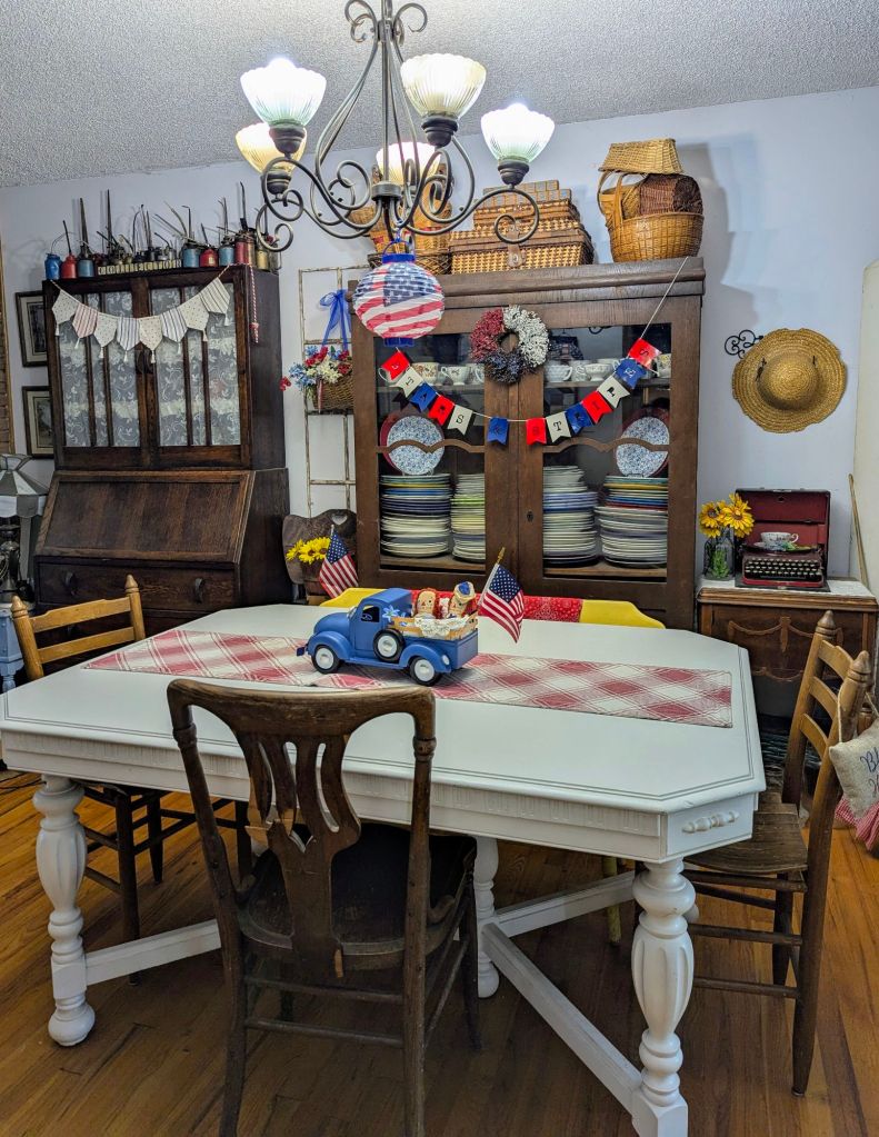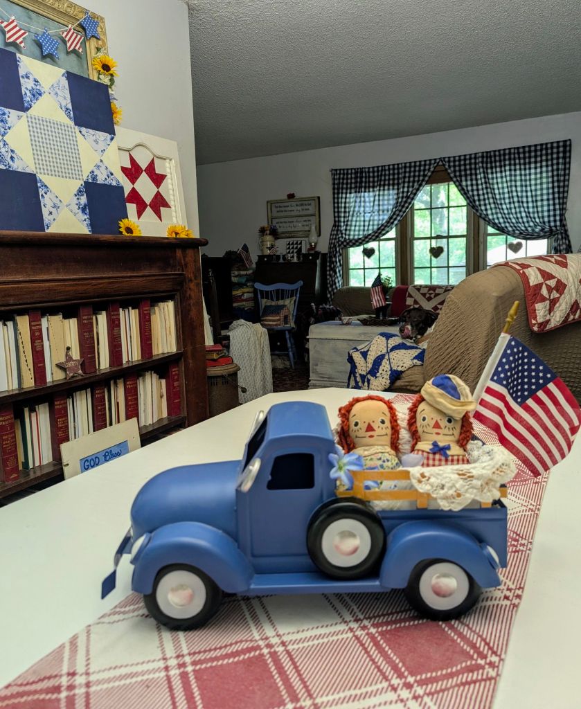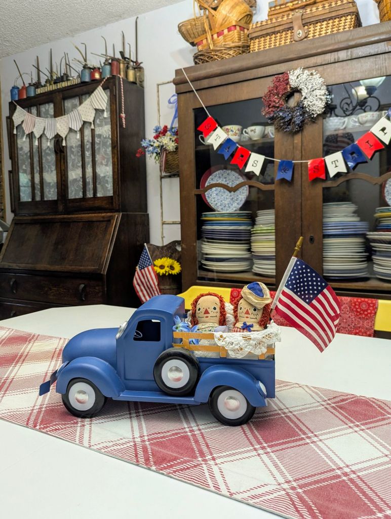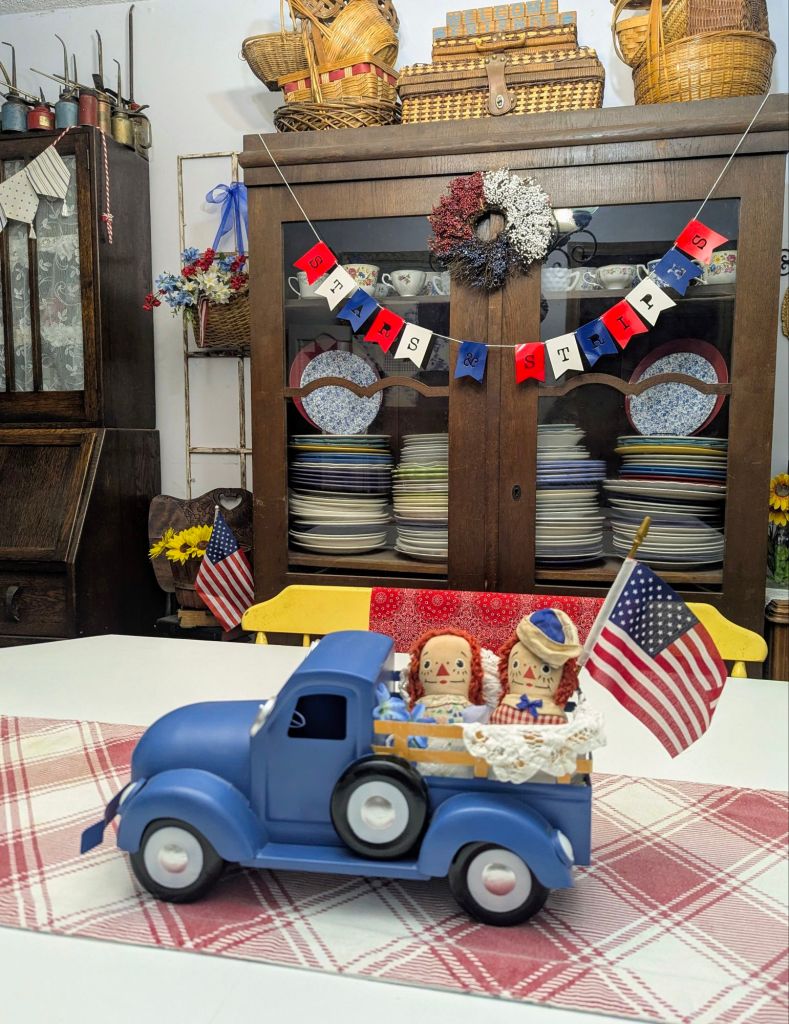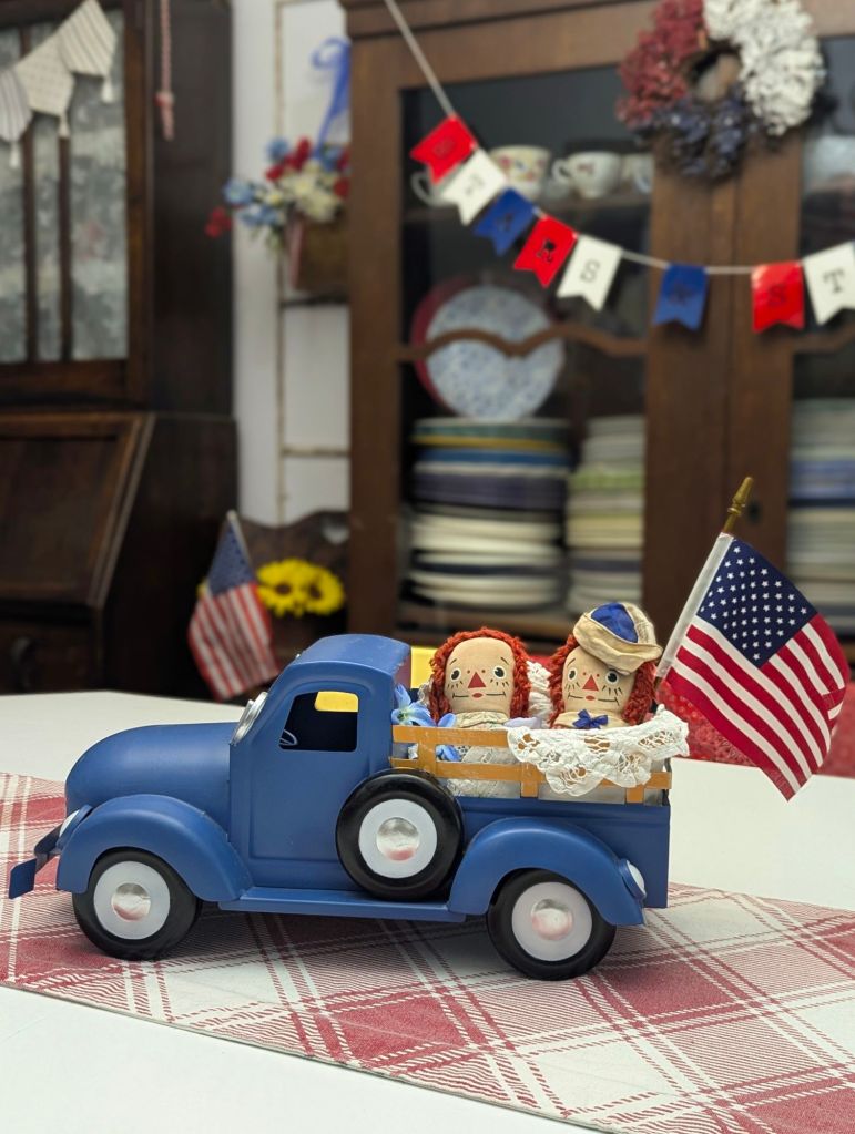 Raggedy Ann and Andy are ready for the Fourth of July parade. I purchased this truly raggedy couple from an Instagram friend. Andy’s feet have been chewed on, and his hat is barely hanging on. To me, that just adds character to our adorable and nostalgic centerpiece. Don’t be afraid to use items that are worn or chipped. They’re a conversation piece with a story.