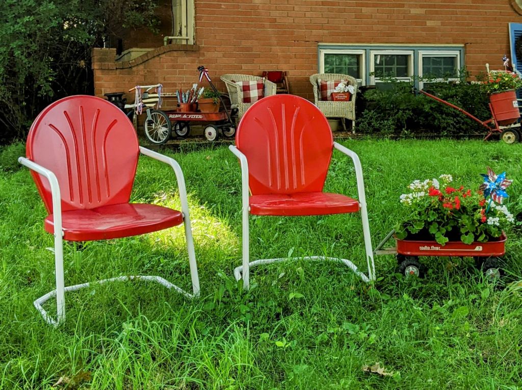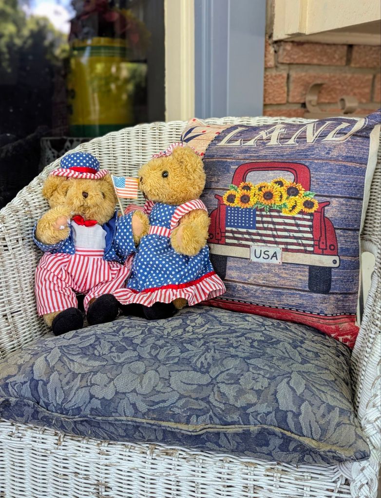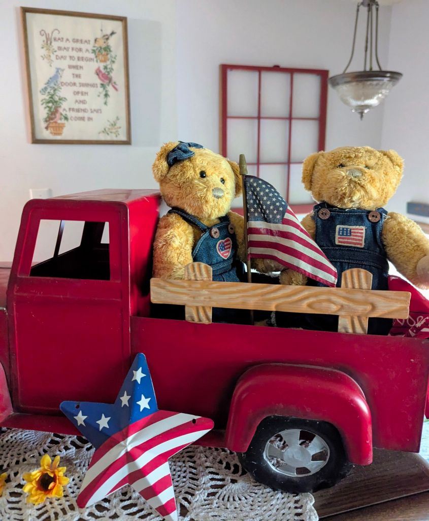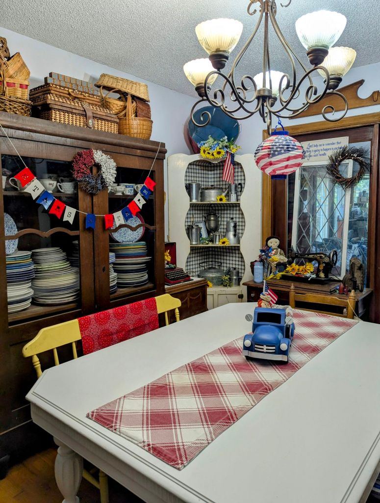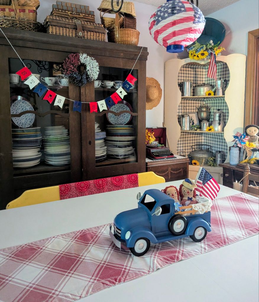 Raggedy Ann and Andy are ready for the Fourth of July parade. I purchased this truly raggedy couple from an Instagram friend. Andy’s feet have been chewed on, and his hat is barely hanging on. To me, that just adds character to our adorable and nostalgic centerpiece. Don’t be afraid to use items that are worn or chipped. They’re a conversation piece with a story.