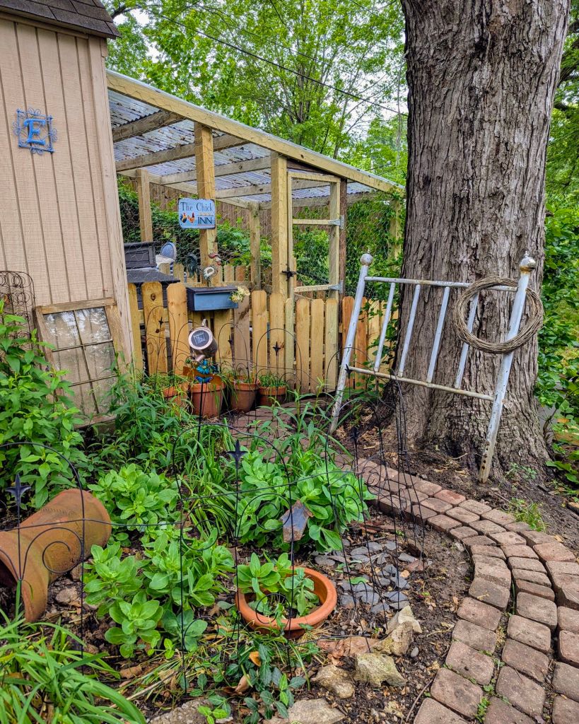 Everything you see was thrifted, gifted or a curbside find. I like to change out the greenhouse displays throughout the year. It doesn’t have to cost a lot to create a backyard haven. Old junk given new life is just my style!
