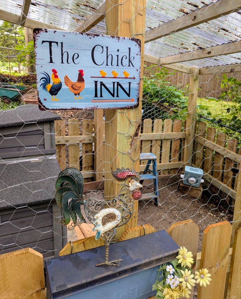 I found the Chick Inn sign on Amazon and couldn’t resist. The gals definitely have a cute little country inn. No rooster in the bunch, just a metal mascot!