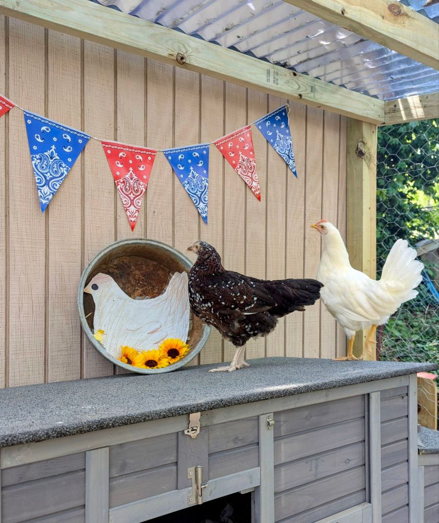 Mary Maggie quickly noticed my rooftop decorations added to the coop. A little girl from VBS created the paper hen and baby chick. The bandana bunting was also rescued during the big VBS decor take down.
