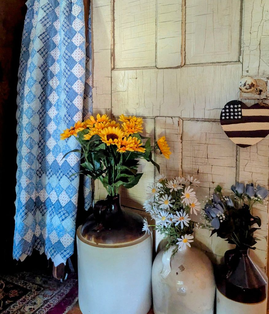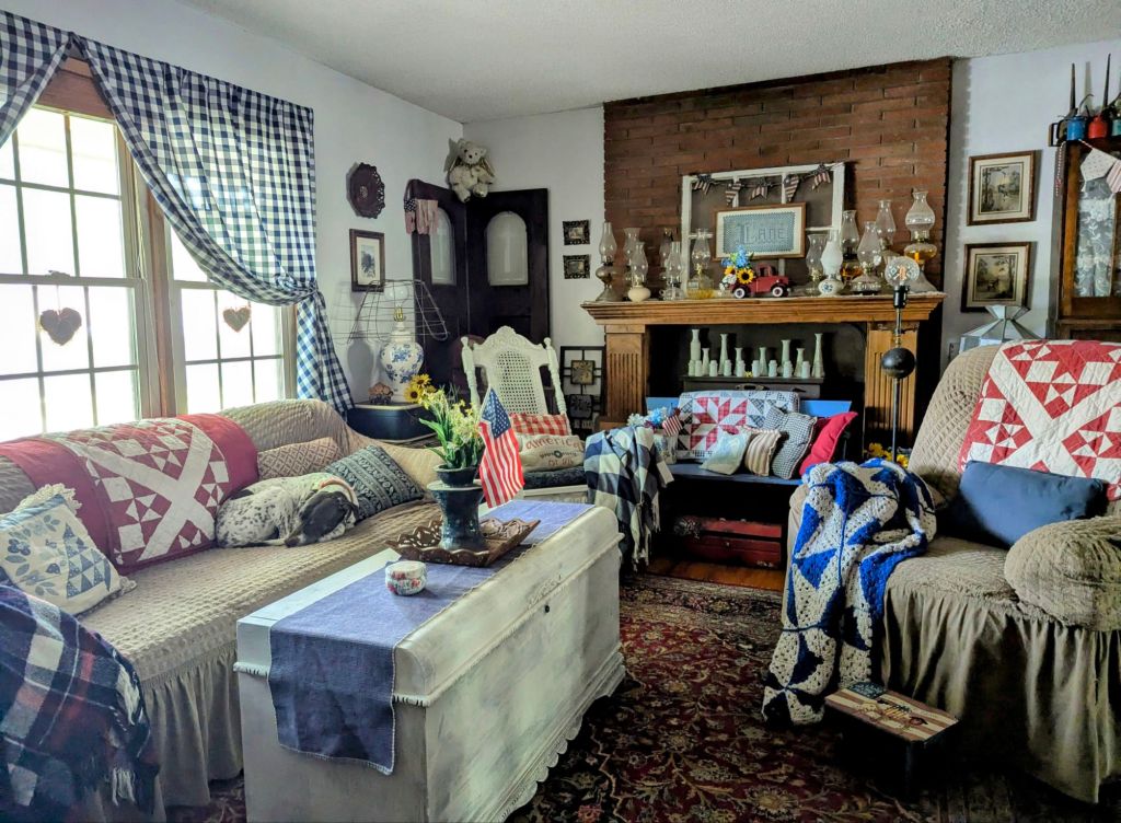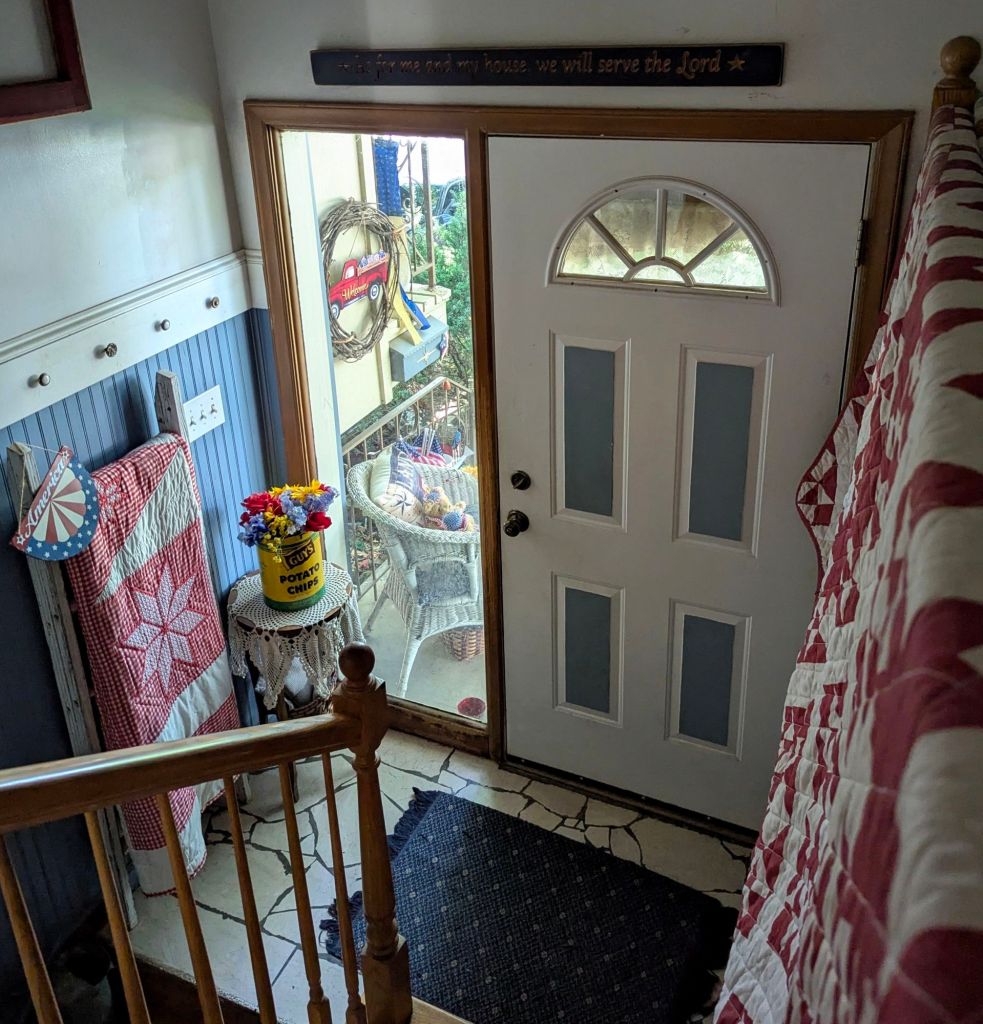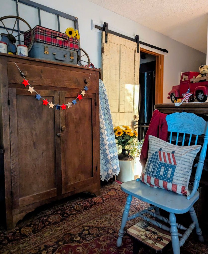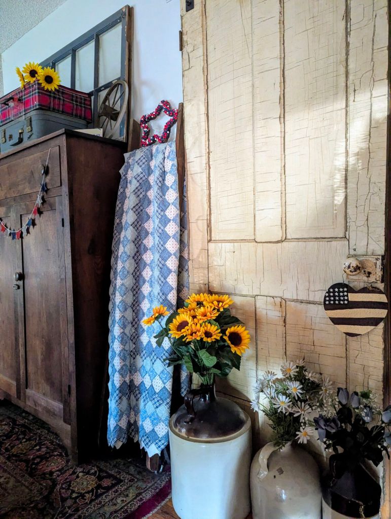An old chippy door is the first thing you’ll see at the top of the stairs, surrounded by flower filled crock jugs and an ever-changing quilt. Split-level landings can be awkward, but I dress ours up with warmth and coziness to beckon family and friends into our living room. Colors, patterns and little details help to create that Americana look.