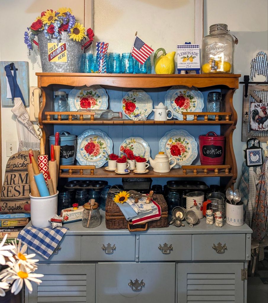 My daughters are quite generous in gifting me with Pioneer Woman dishes, including the butter dish. Old rolling pins get a colorful facelift with cheap dollar store wrapping paper. It’s a small detail that adds whimsy and cottage charm. Don’t miss the old tin cookie cutter star! An Americana decor detail!