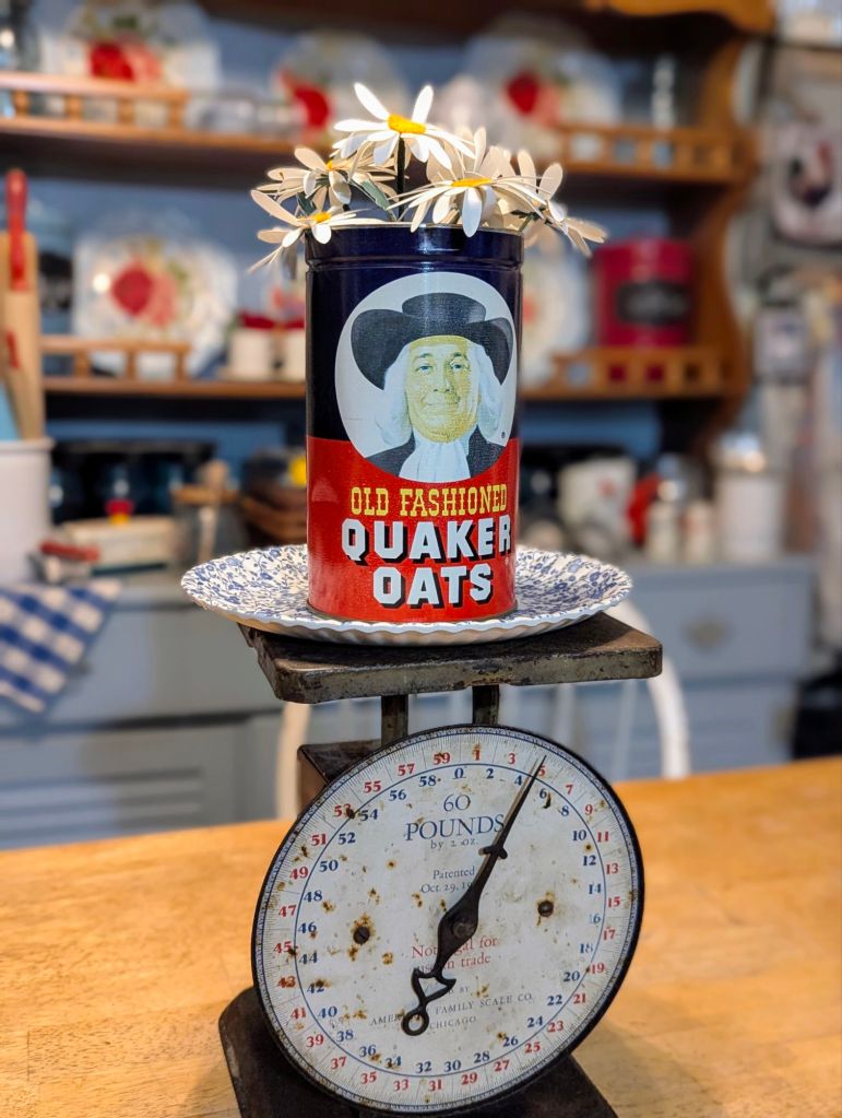 Vintage tins make wonderful vases. This one is displaying homemade summer daisies. The tin graphics are perfect for Americana decor.