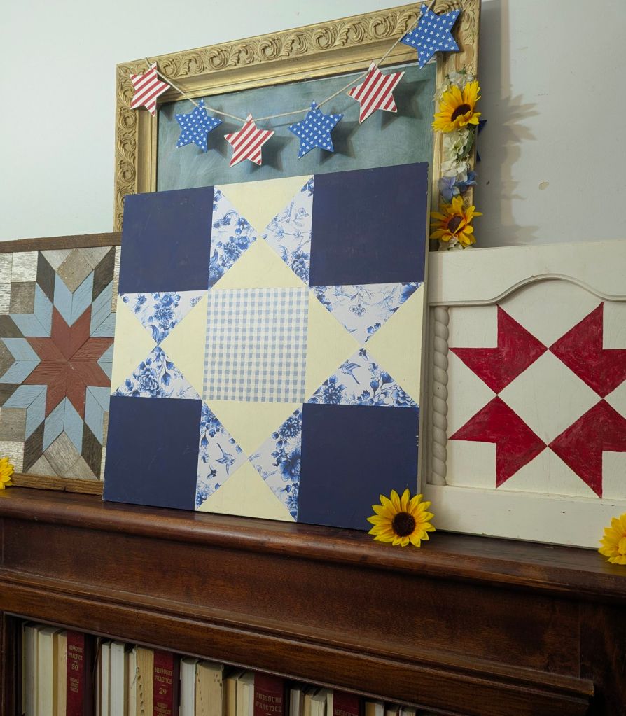 The center star was bought unfinished for $1 at a moving sale. The star was drawn in pencil and the dark blue squares were painted on it. I added wallpaper to complete it. I might lighten the dark blue squares. What do you think?