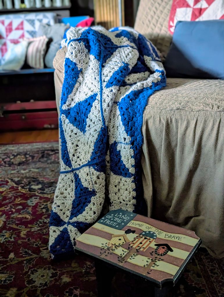 My mom-in-love crocheted the blue and white pinwheel afghan. It’s a must for snuggling. The matching pinwheel patterned quilt hung over the blue bench was one of my first big girl quilts from at least 20 years ago.