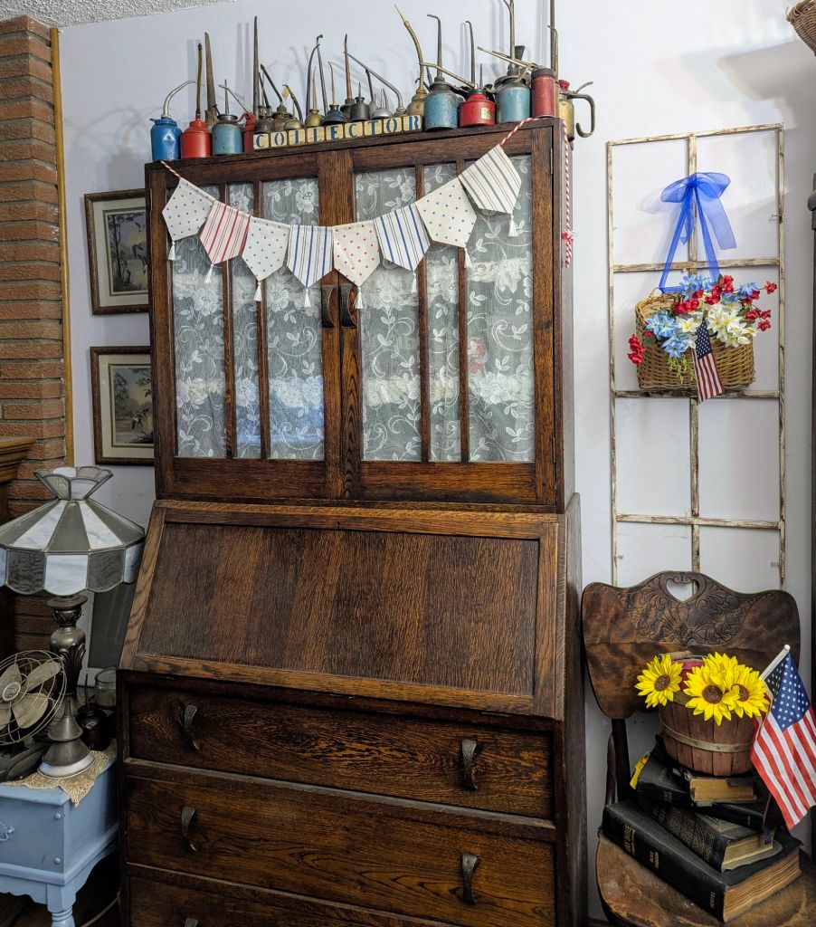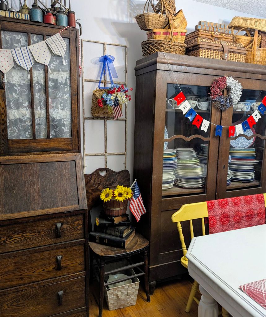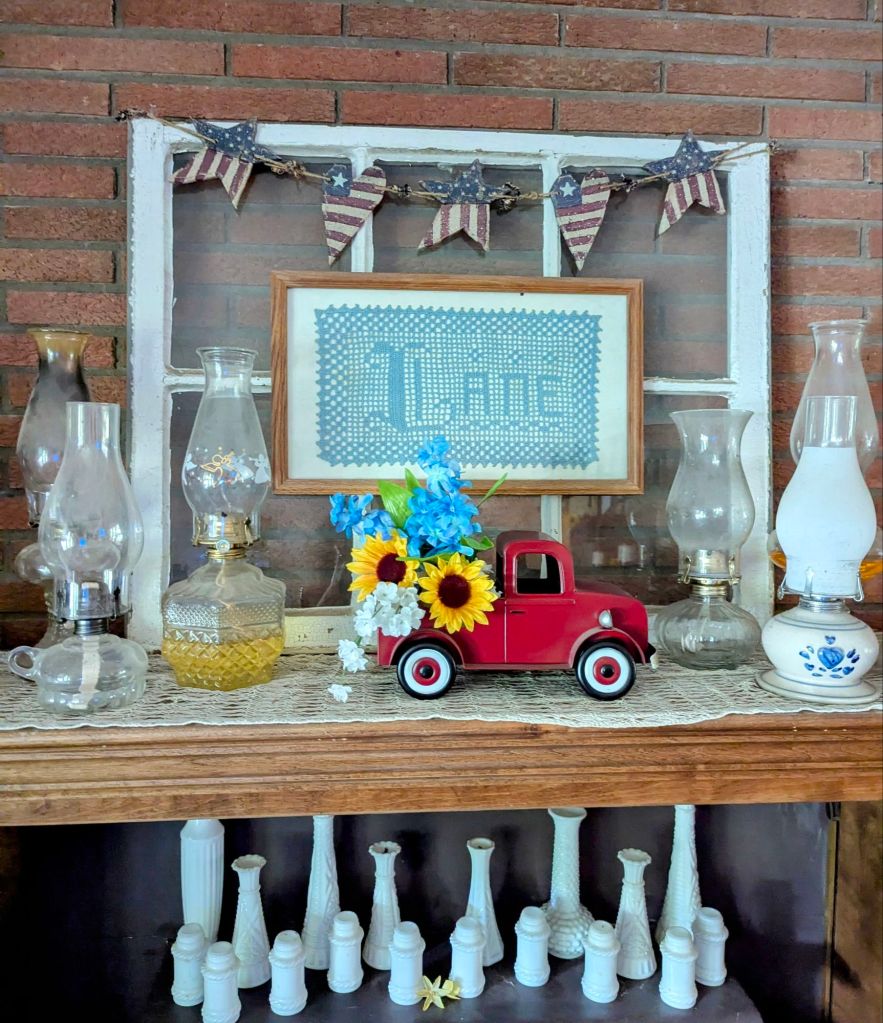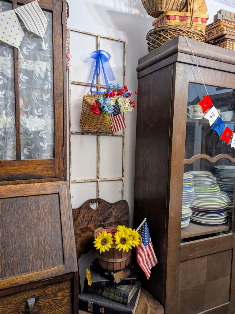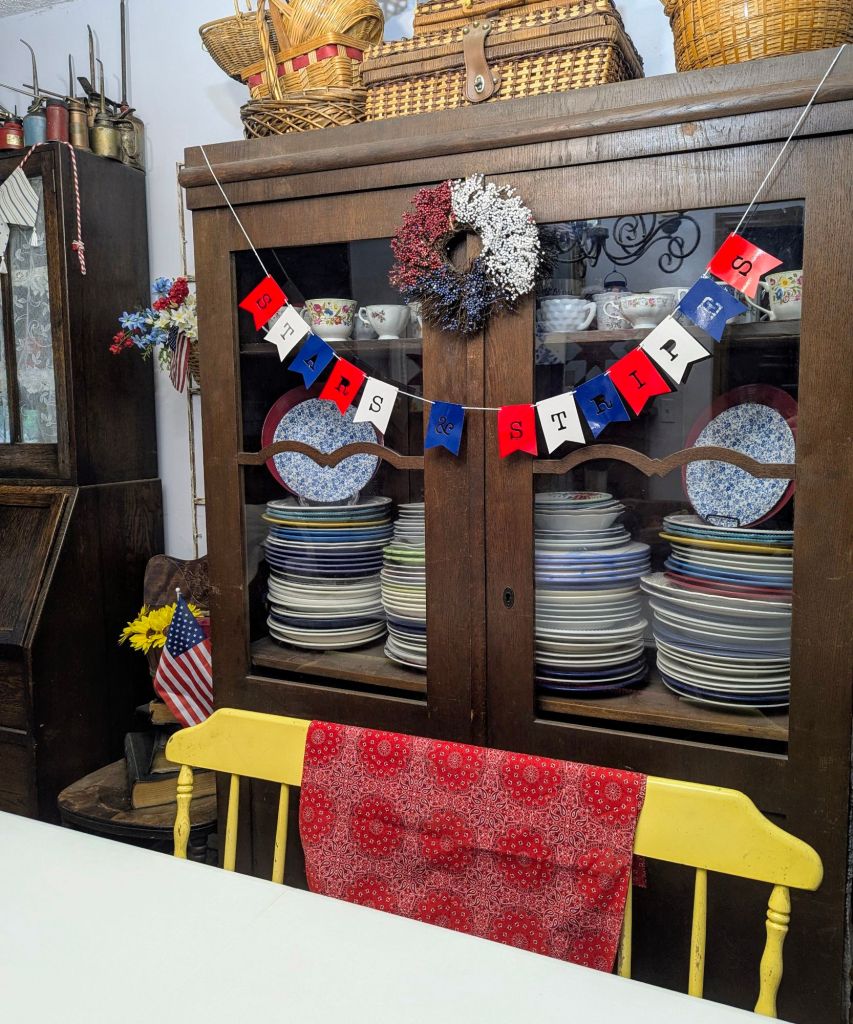 This is one of my favorite places to get creative. Usually, I create some sort of chalkboard message with vintage collections. This display is a nice change for an Americana Fourth of July.